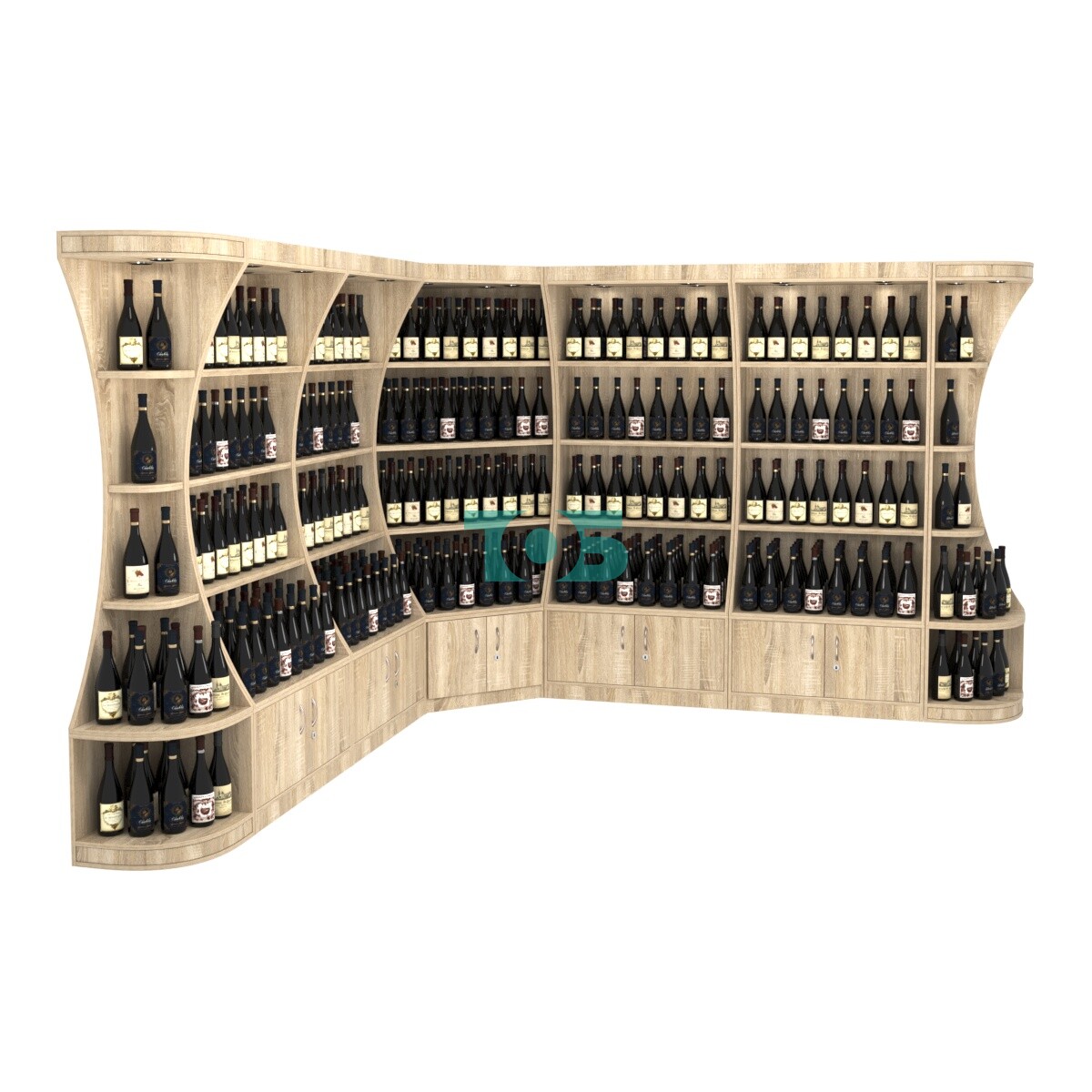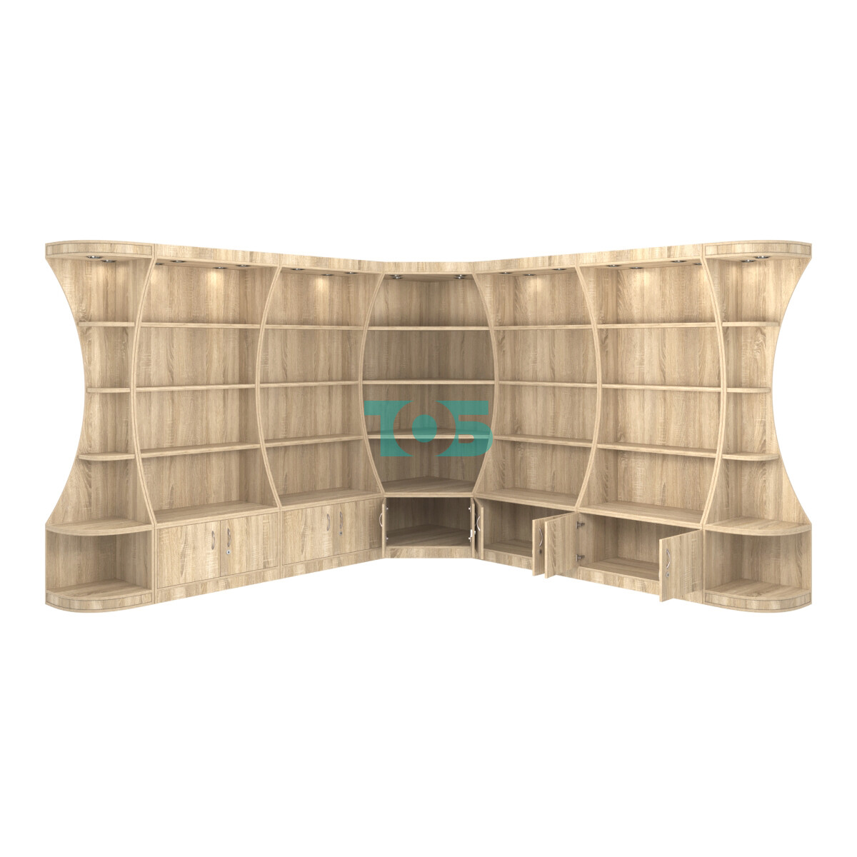 - включает семь отдельных модулей - один высокий угловой стеллаж, четыре высоких прямоугольных стеллажа и два стеллажа-сектора серии COSMETIC, образующих внешние углы;