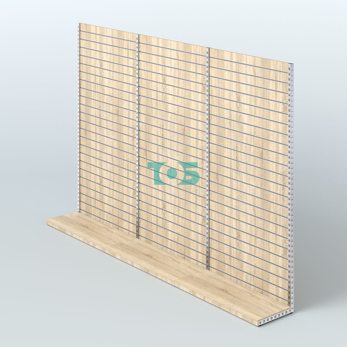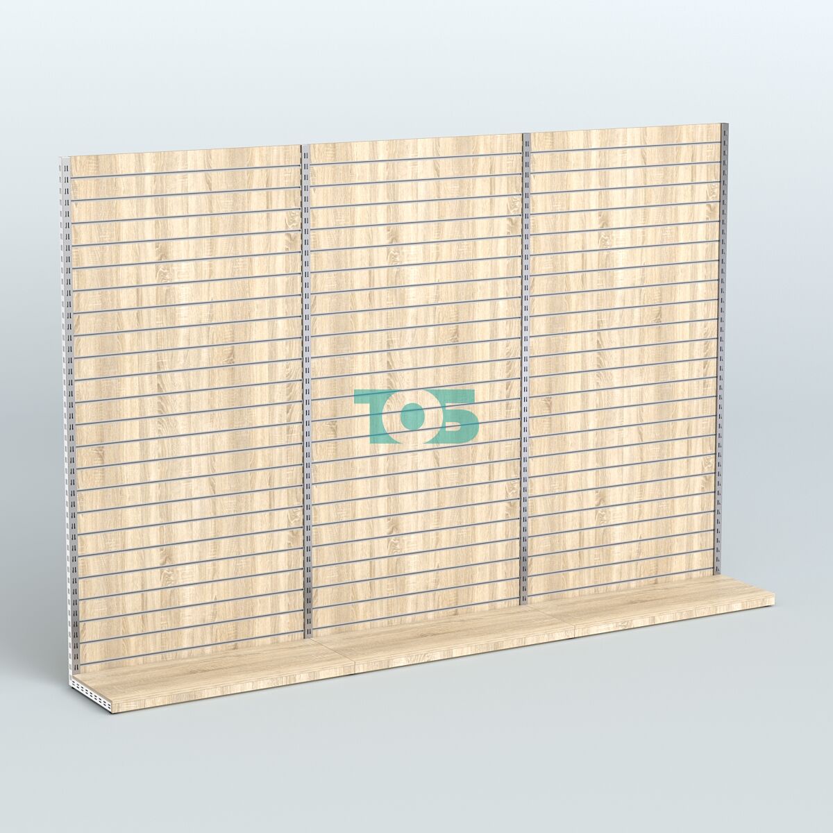 Настенная система для торговли одеждой METAL с задней стенкой шириной 3000 мм с пристенными поручнями и полками из тонированного стекла №11