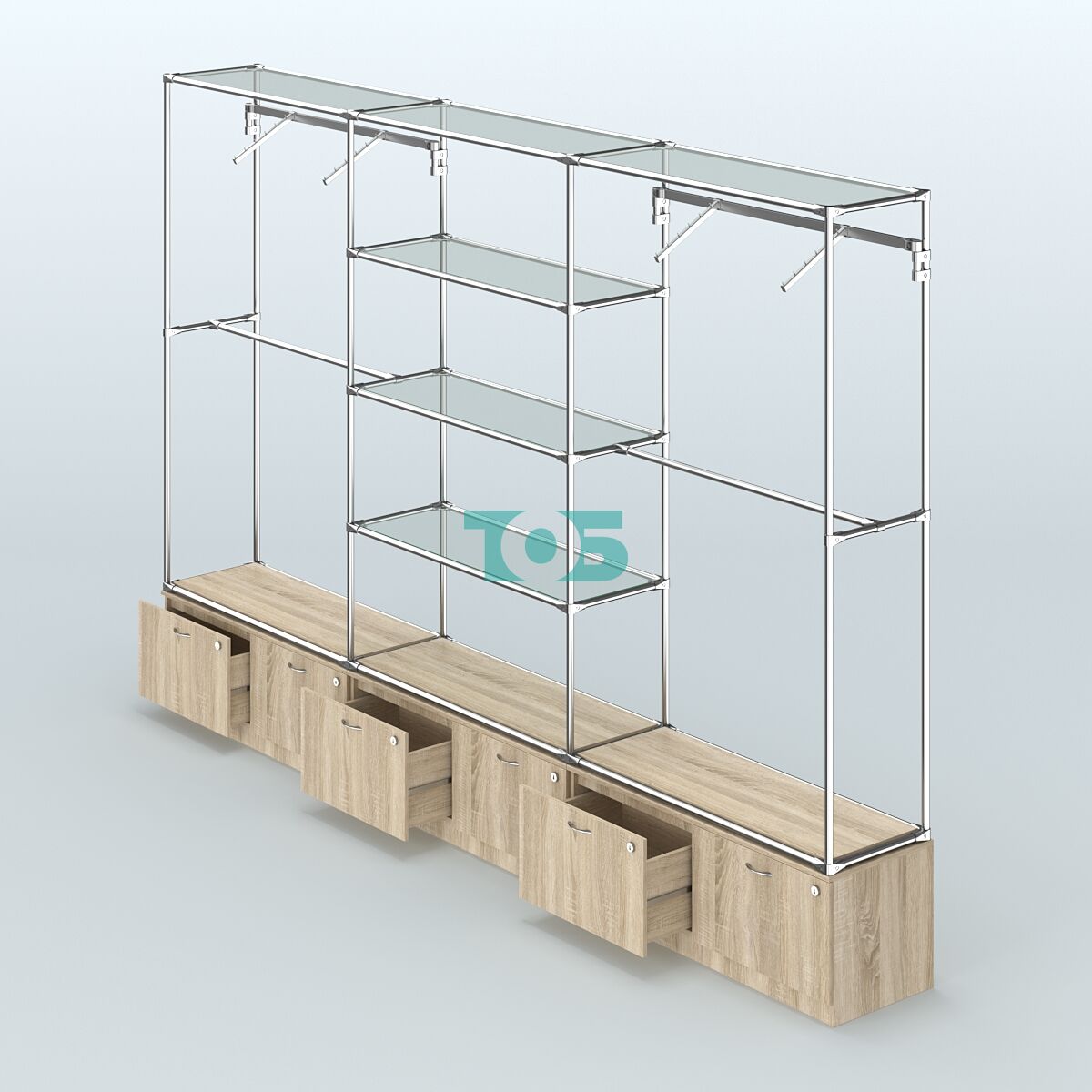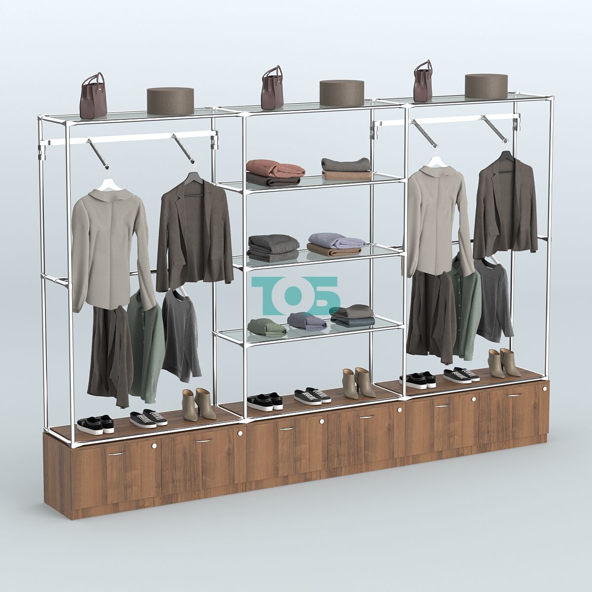 Настенная система для торговли одеждой METAL с задней стенкой шириной 3000 мм с пристенными поручнями и полками из тонированного стекла №11