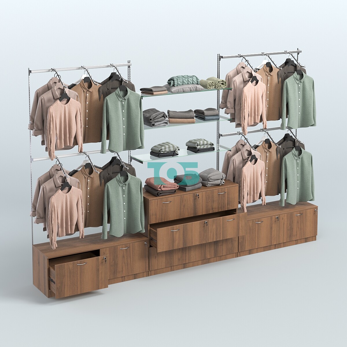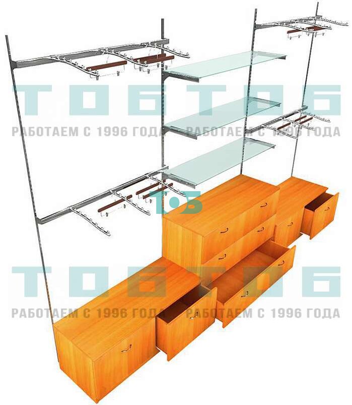 Настенная система для торговли одеждой METAL с поручнем и прозрачными полками без задней стенки шириной 1000 мм №6