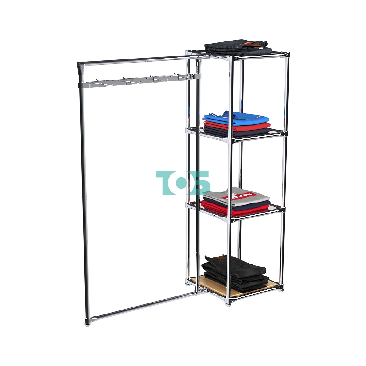 • Прямоугольная хромированная штанга в левом крыле: Идеальна для крючков или кронштейнов на квадратную трубу, при этом штангу можно регулировать по высоте в зависимости от габаритов товара, а также добавлять или убирать дополнительные элементы.