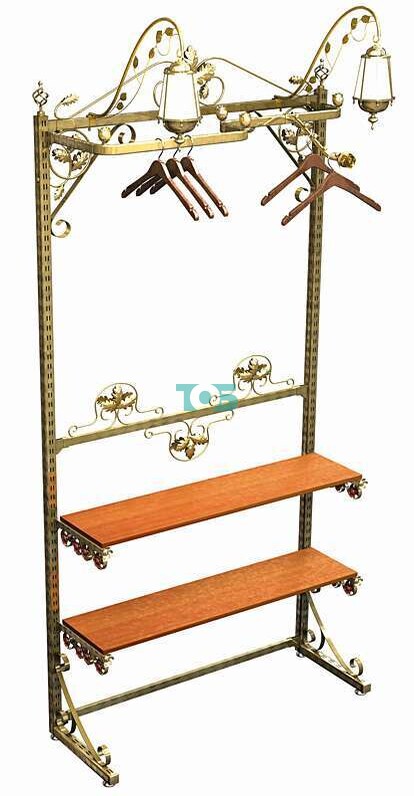 Торговая пристенная угловая система серии METAL для одежды с П-образными поручнями и полками ДСП с задней стенкой №3