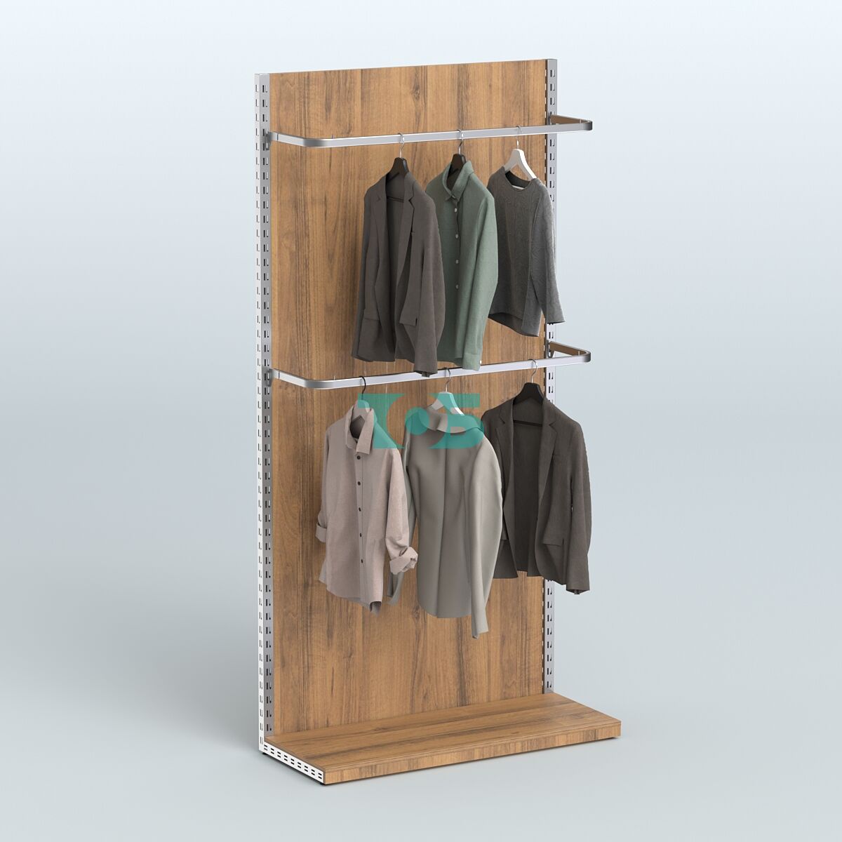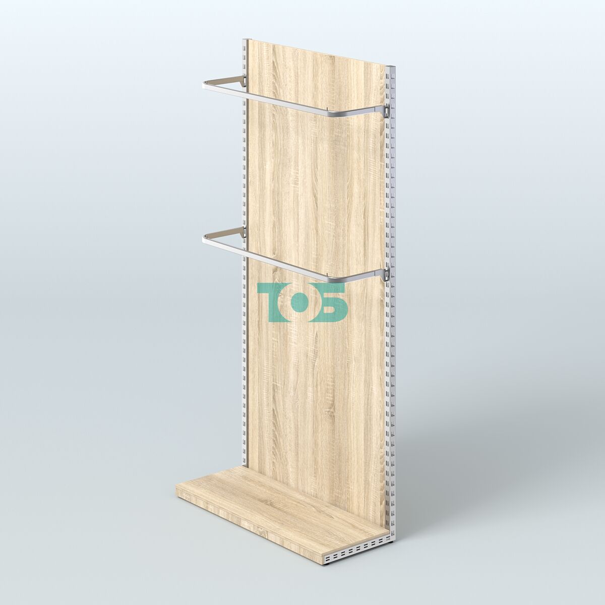 Торговая пристенная угловая система серии METAL для одежды с П-образными поручнями и полками ДСП с задней стенкой №3