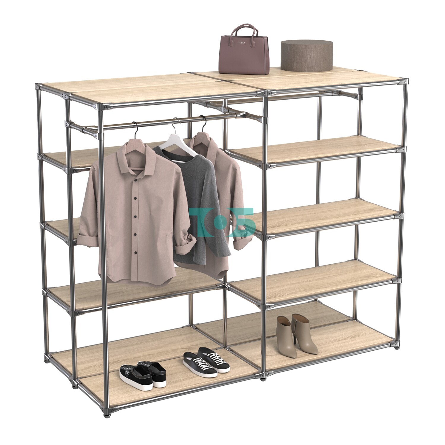 • Два внутренних усиленных поручня с возможностью регулирования по высоте: Позволяют демонстрировать одежду различными способами, предоставляя гибкость в выкладке товара и возможность адаптировать высоту под разные типы одежды.