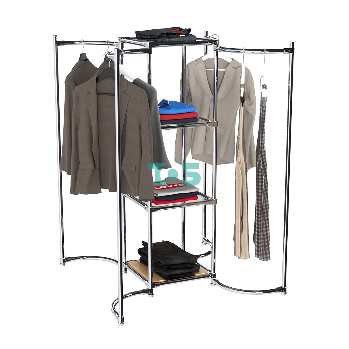 Дугообразные хромированные штанги для плечиков с четырех сторон конструкции: Обеспечивают удобное размещение одежды на плечиках и позволяют демонстрировать товар с разных сторон.