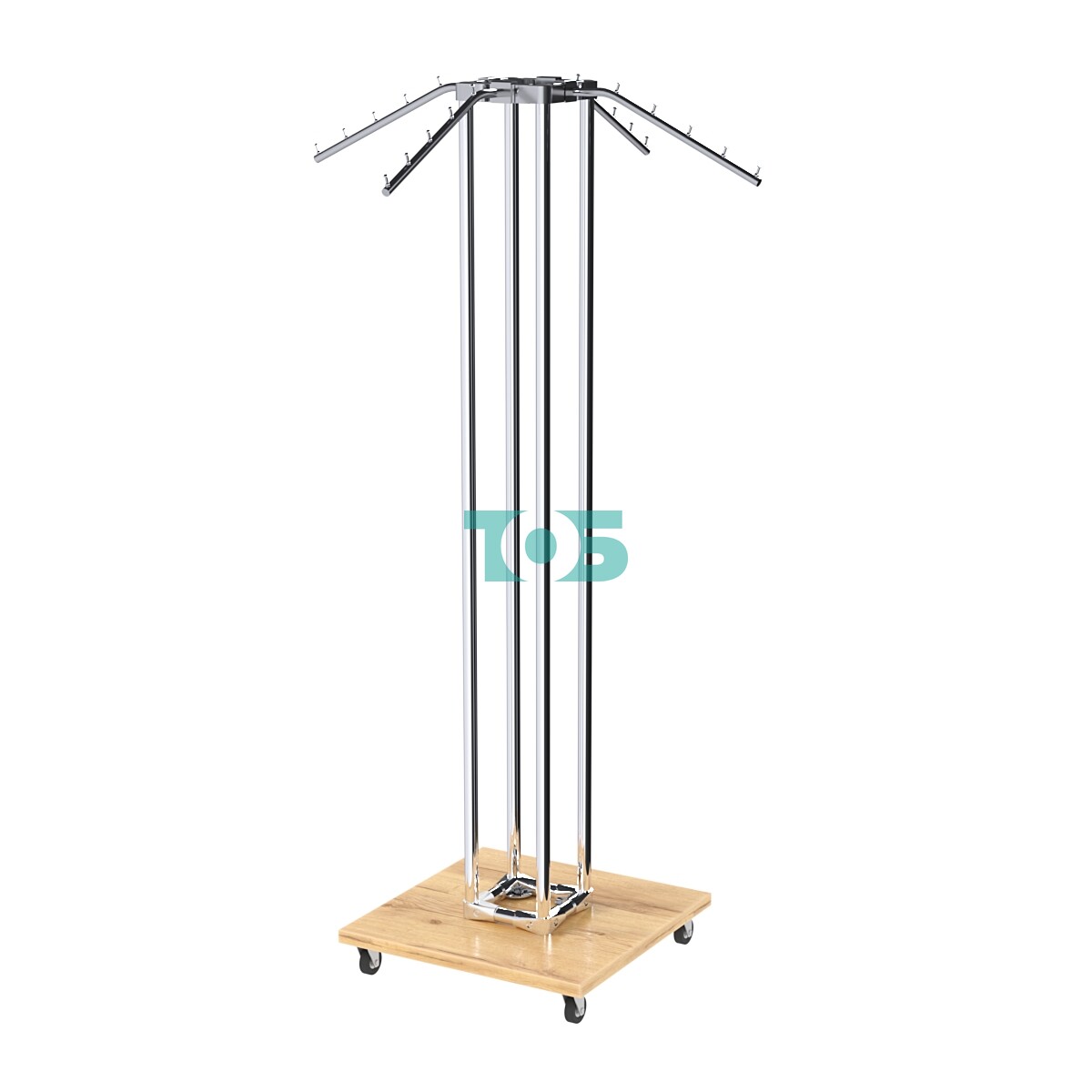 1. Четырехсторонняя конструкция: Позволяет эффективно использовать пространство, демонстрируя одежду с разных сторон, что улучшает обзор и доступность товара.