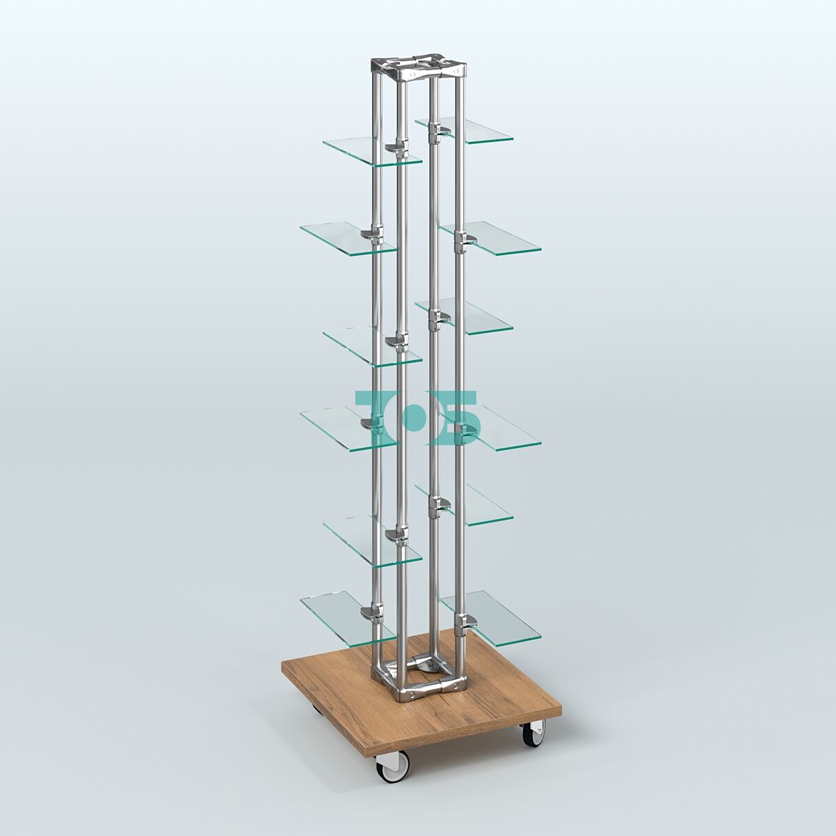 Полки: Двенадцать полок из прозрачного стекла толщиной 6 мм, обеспечивающие хороший обзор выставленных товаров и создающие ощущение легкости и воздушности конструкции.