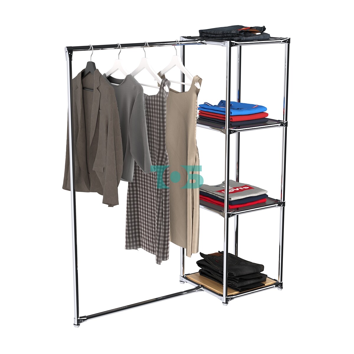 Хромированная труба в левом крыле для плечиков: В конструкции предусмотрена труба, которую можно регулировать по высоте, а также добавлять или убирать дополнительные трубы-стяжки.