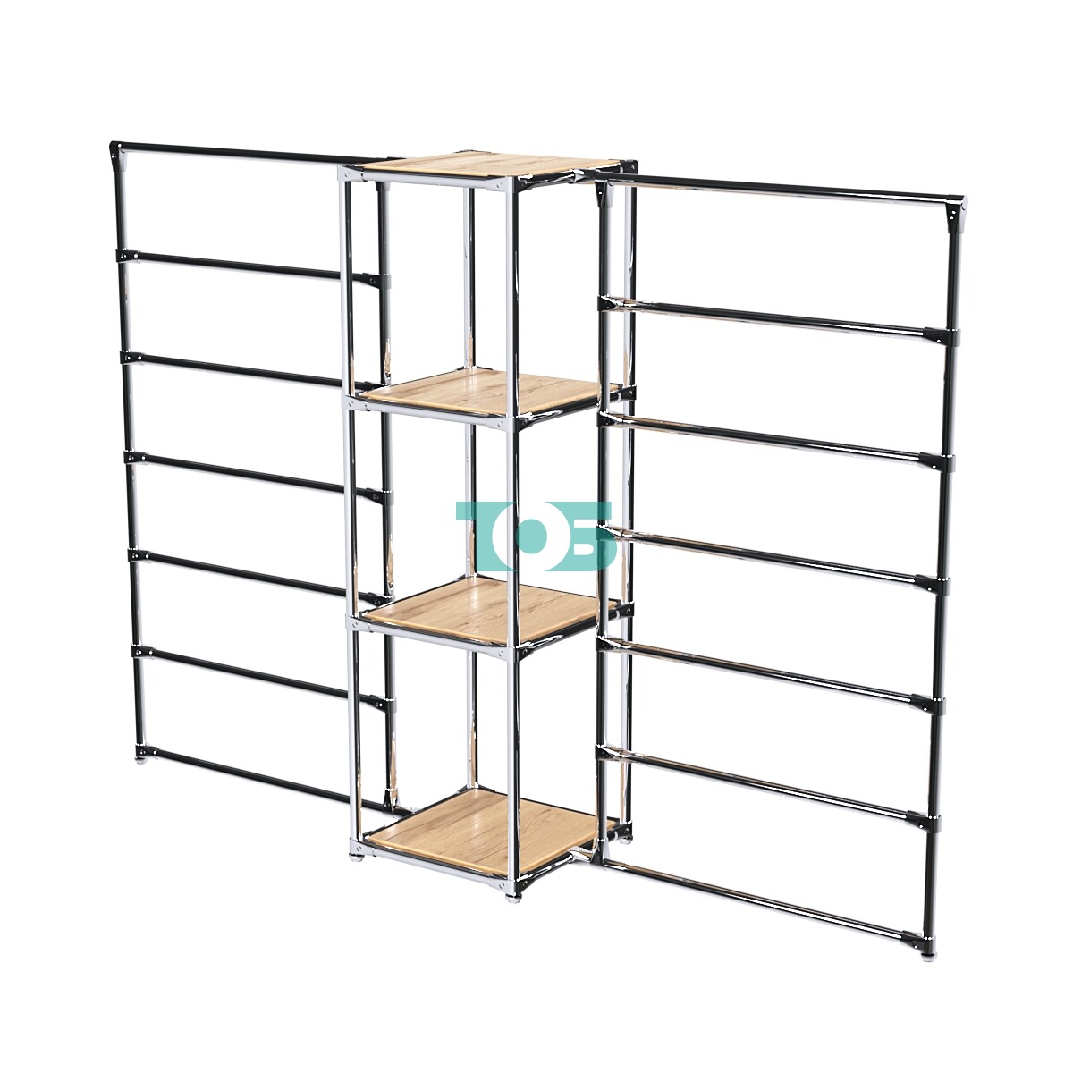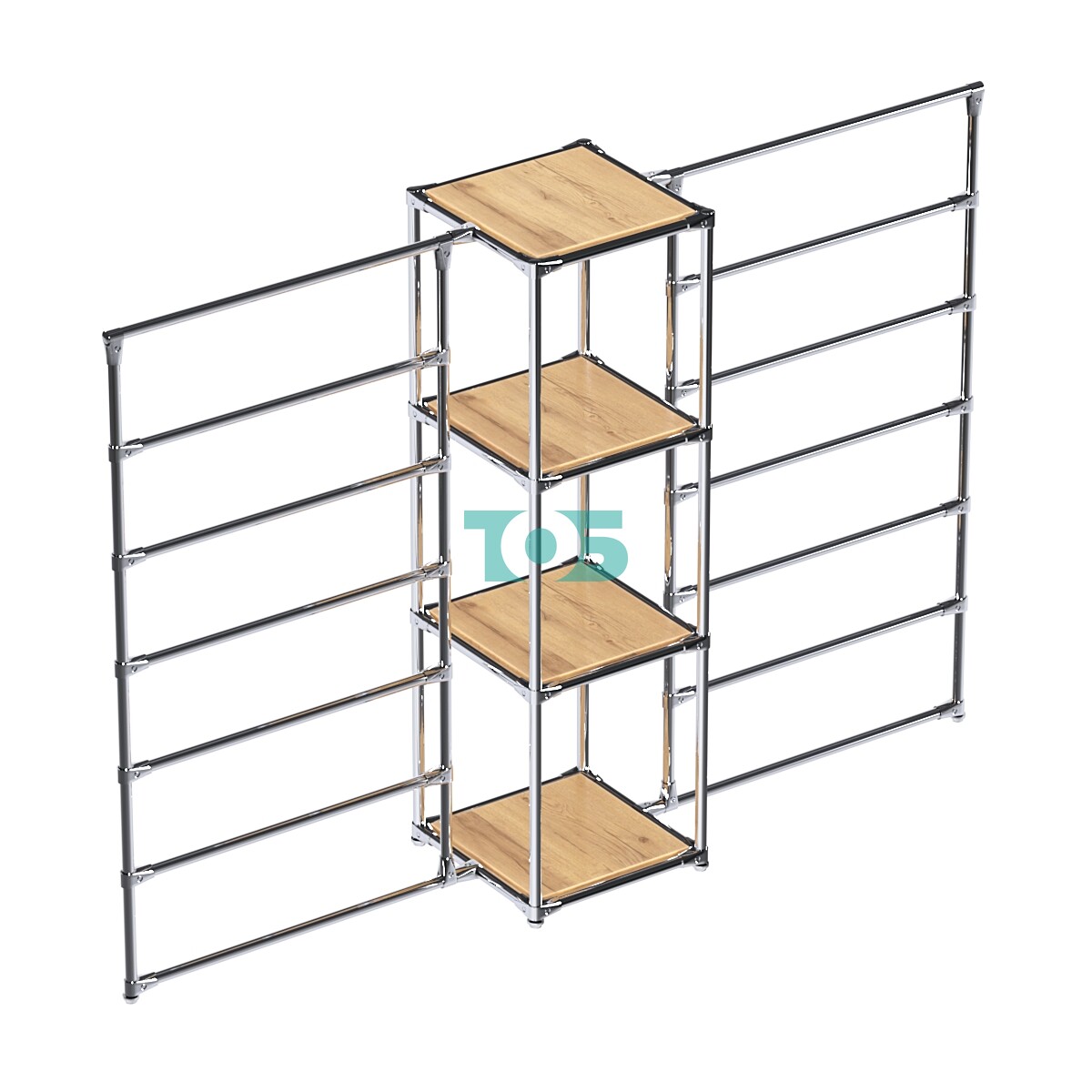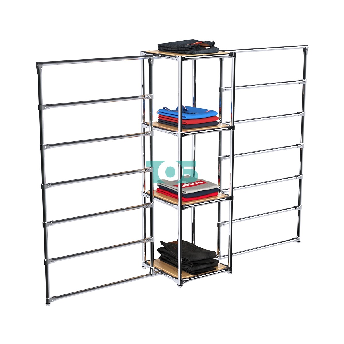 Семь круглых хромированных труб в каждом крыле: Создают удобные возможности для демонстрации товаров, при этом трубы можно регулировать по высоте в зависимости от габаритов товара.