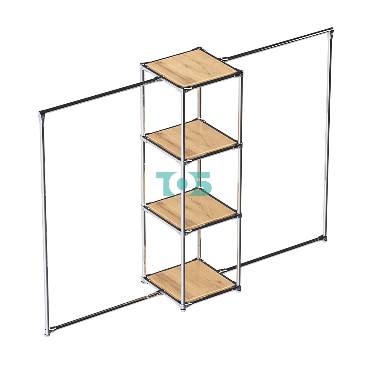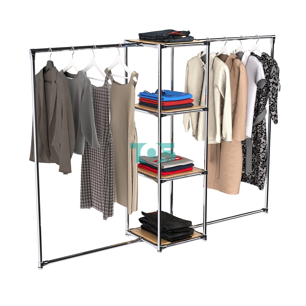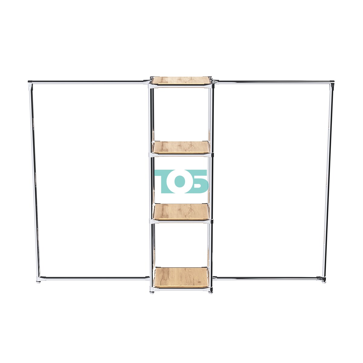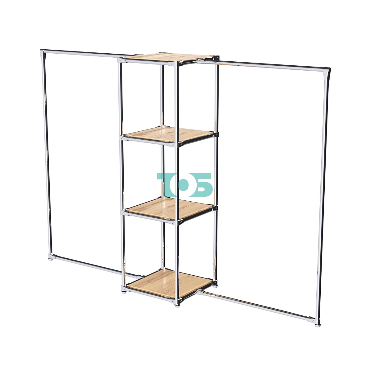 Хромированные трубы для плечиков: Размещены в левом и правом крыле конструкции, их можно регулировать по высоте в зависимости от габаритов одежды. Также возможно добавление или удаление дополнительной трубы-стяжки.