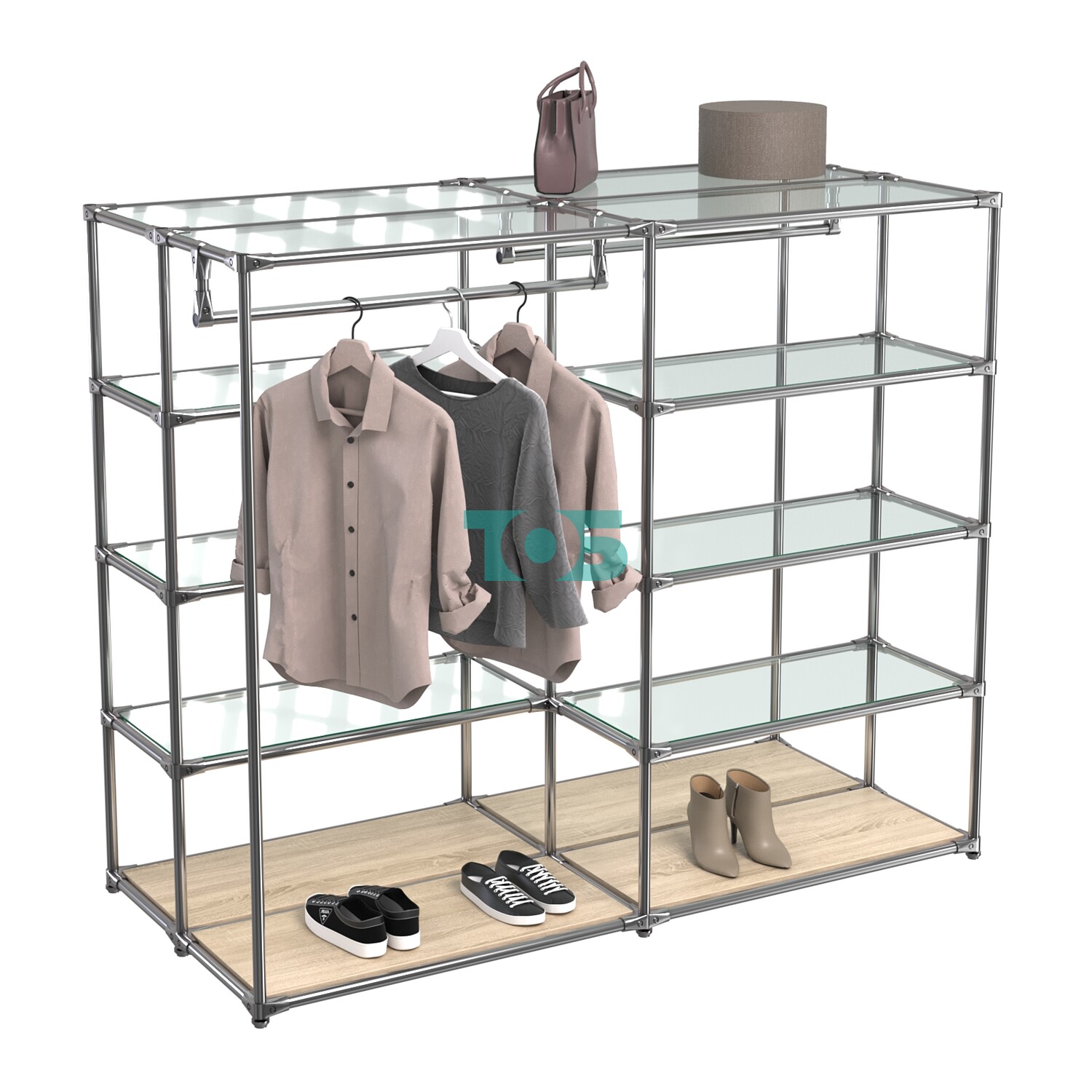 Шесть стеклянных полок 6 мм в хромированной обвязке: Придают конструкции легкость и элегантность, а также позволяют размещать дополнительные товары, такие как аксессуары или небольшие предметы одежды.