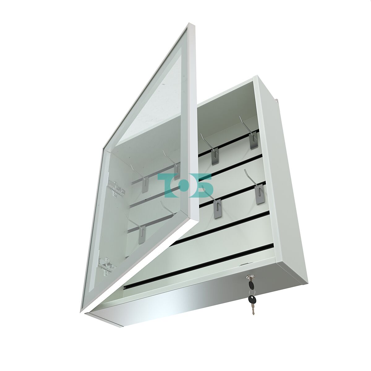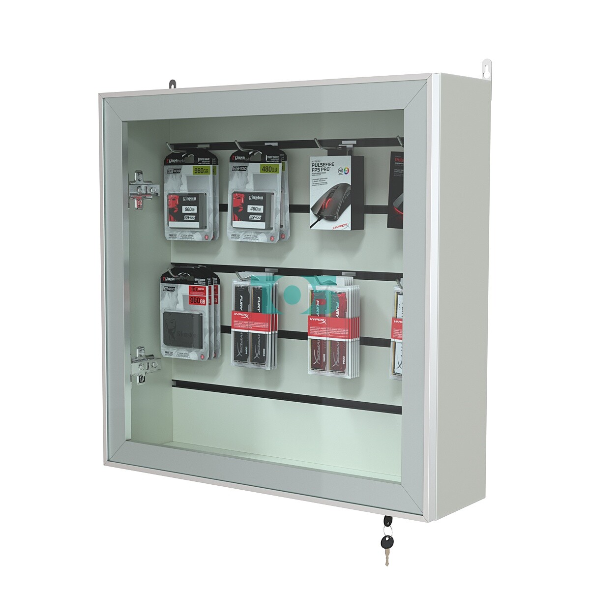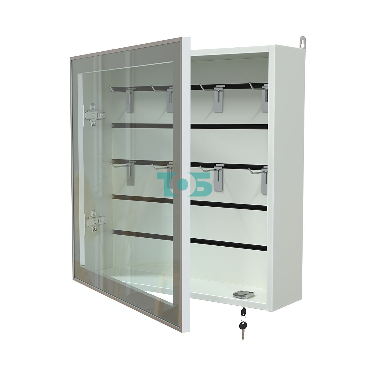 Универсальная эконом панель: задняя стенка витрины оснащена специальной панелью, позволяющей легко монтировать различные аксессуары и крепления для демонстрации товаров.
