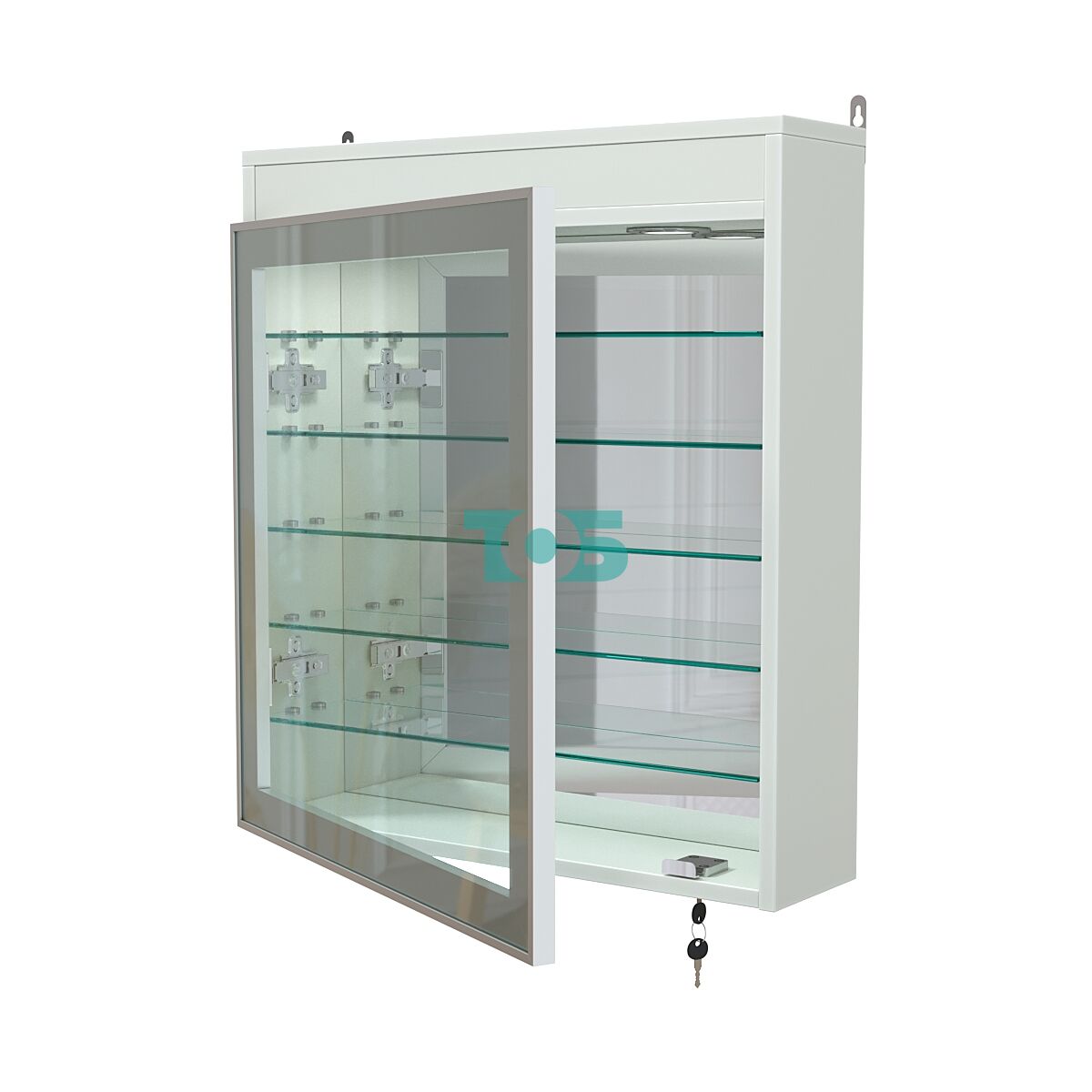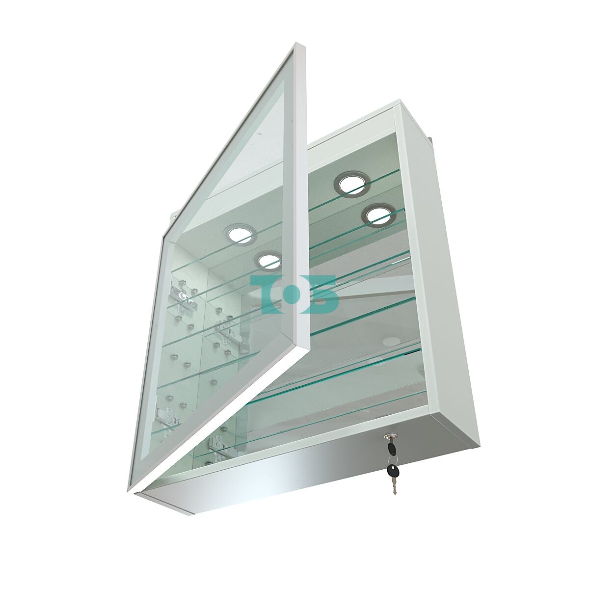 Зеркальная задняя стенка: специальное зеркальное покрытие визуально увеличивает пространство, отражает свет и создаёт эффект глубины, что особенно важно при демонстрации ювелирных изделий, аксессуаров и других ценных предметов.