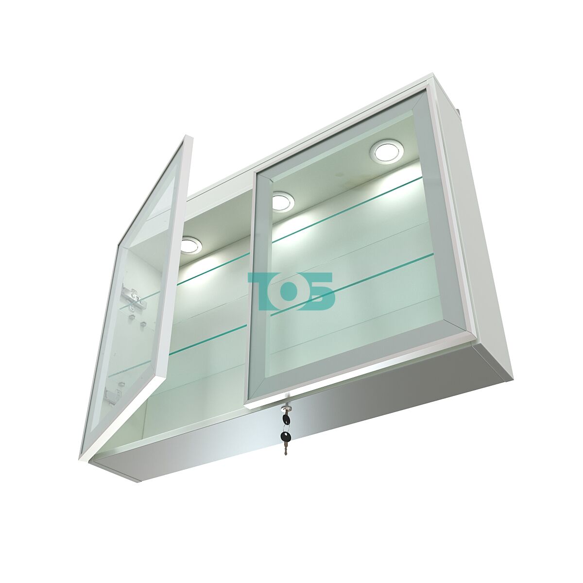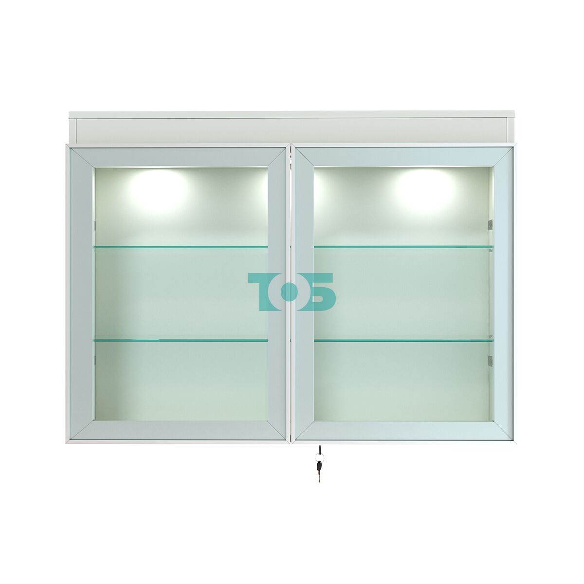 Верхний фриз оснащён тремя встроенными светильниками, создающими равномерное освещение и подчёркивающими презентабельность экспонатов