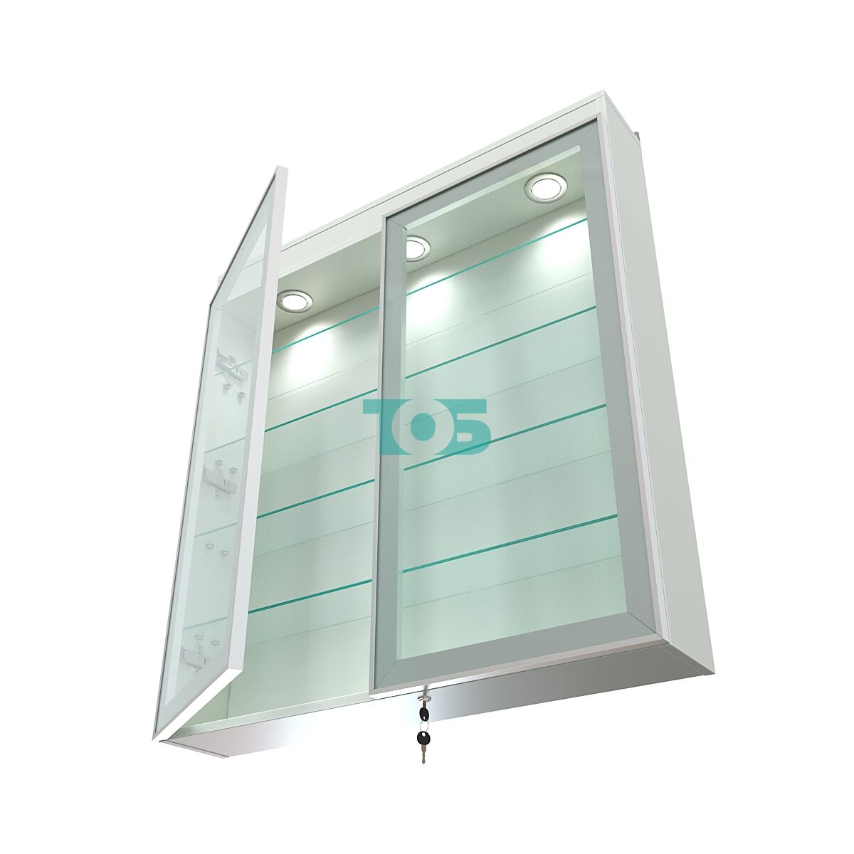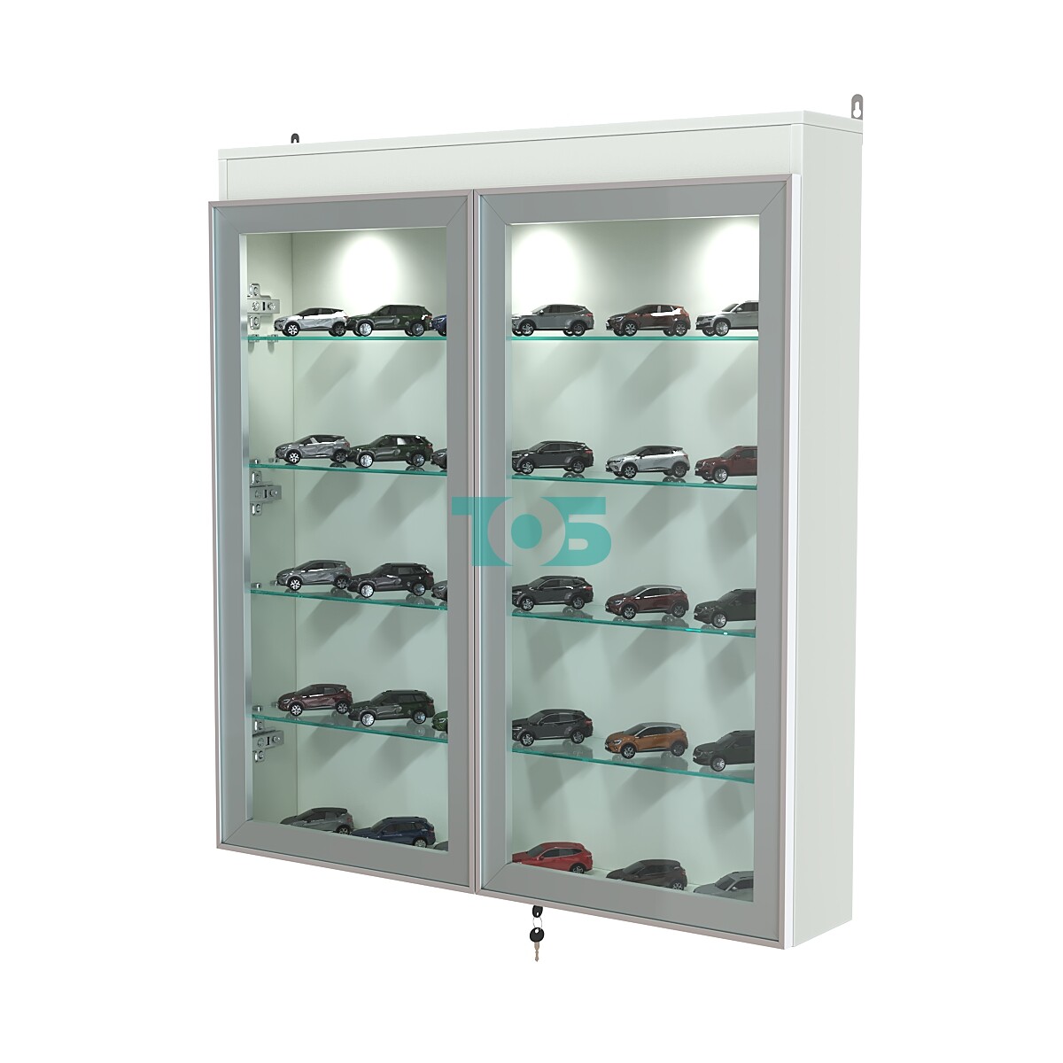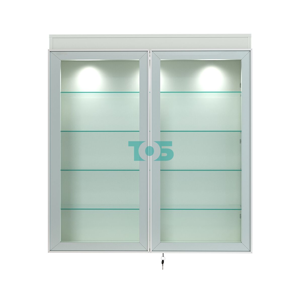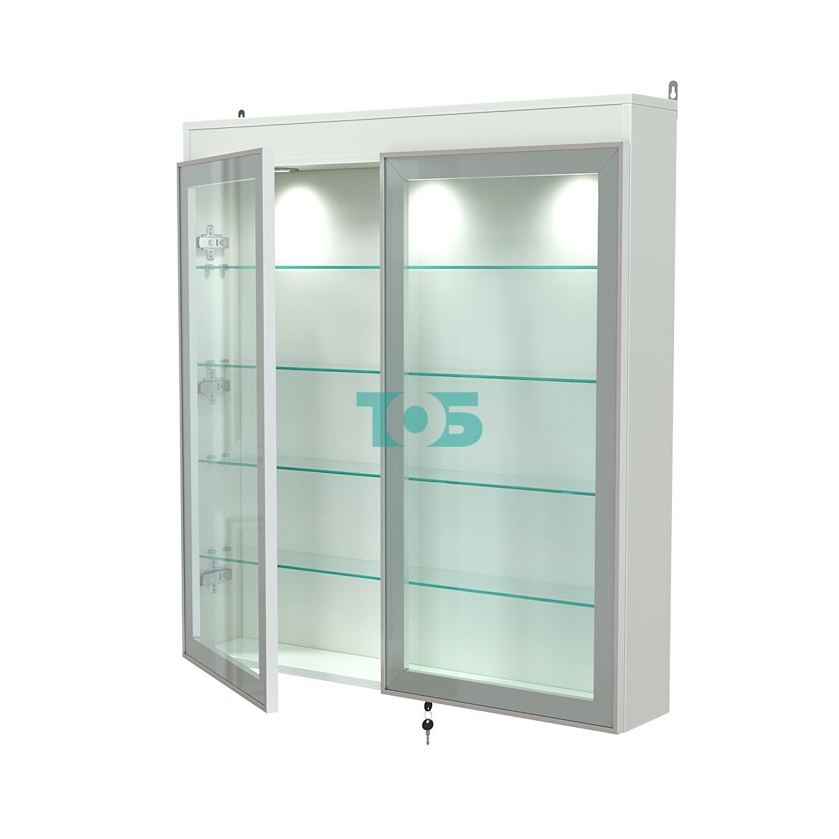 Две стеклянные распашные двери в алюминиевом каркасе с надёжным замком — обеспечивают удобный доступ к содержимому и максимальную защиту от несанкционированного доступа