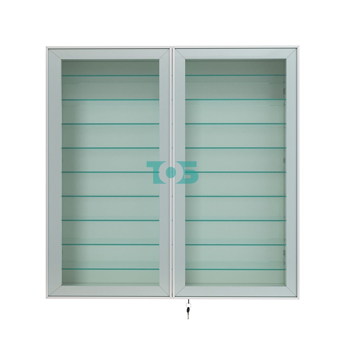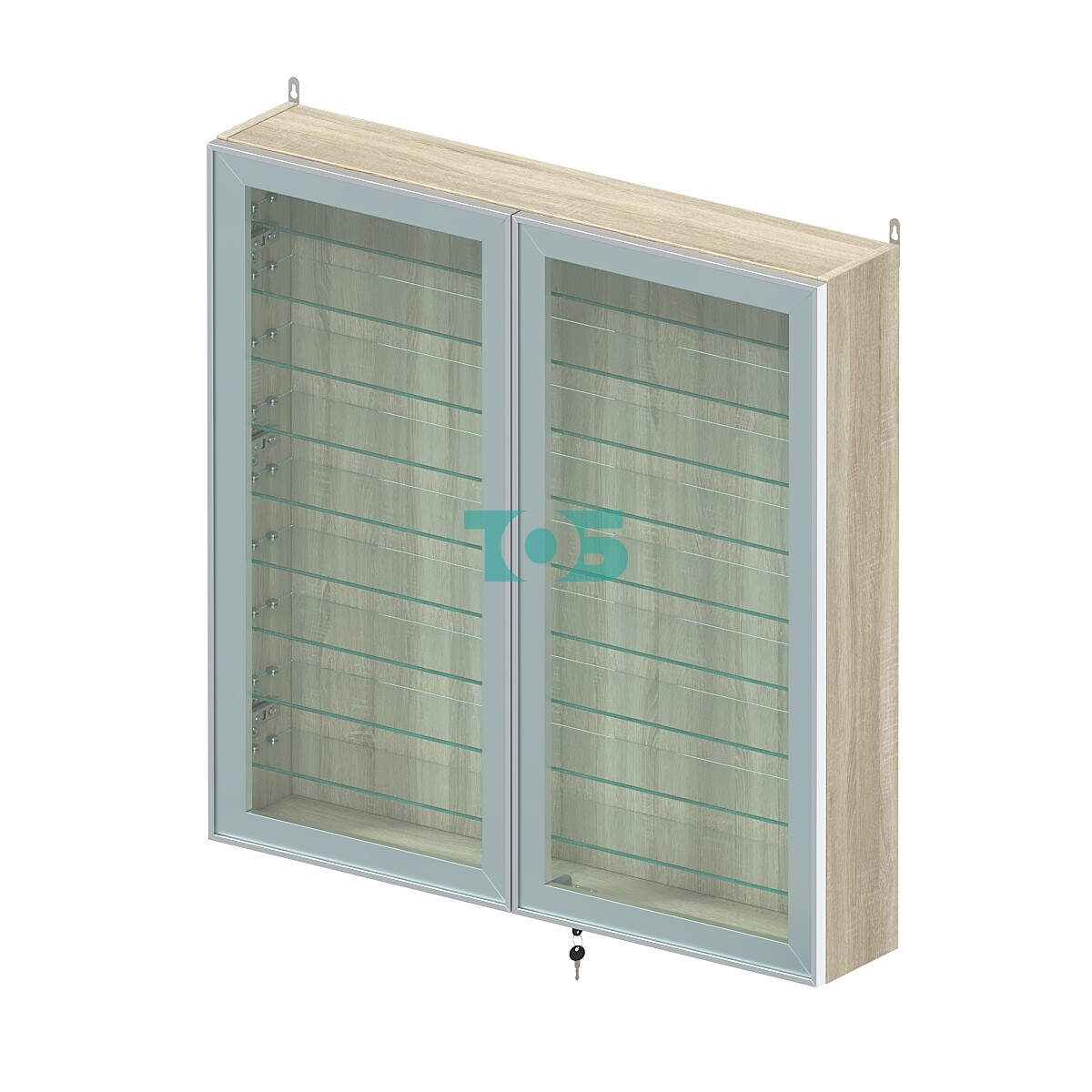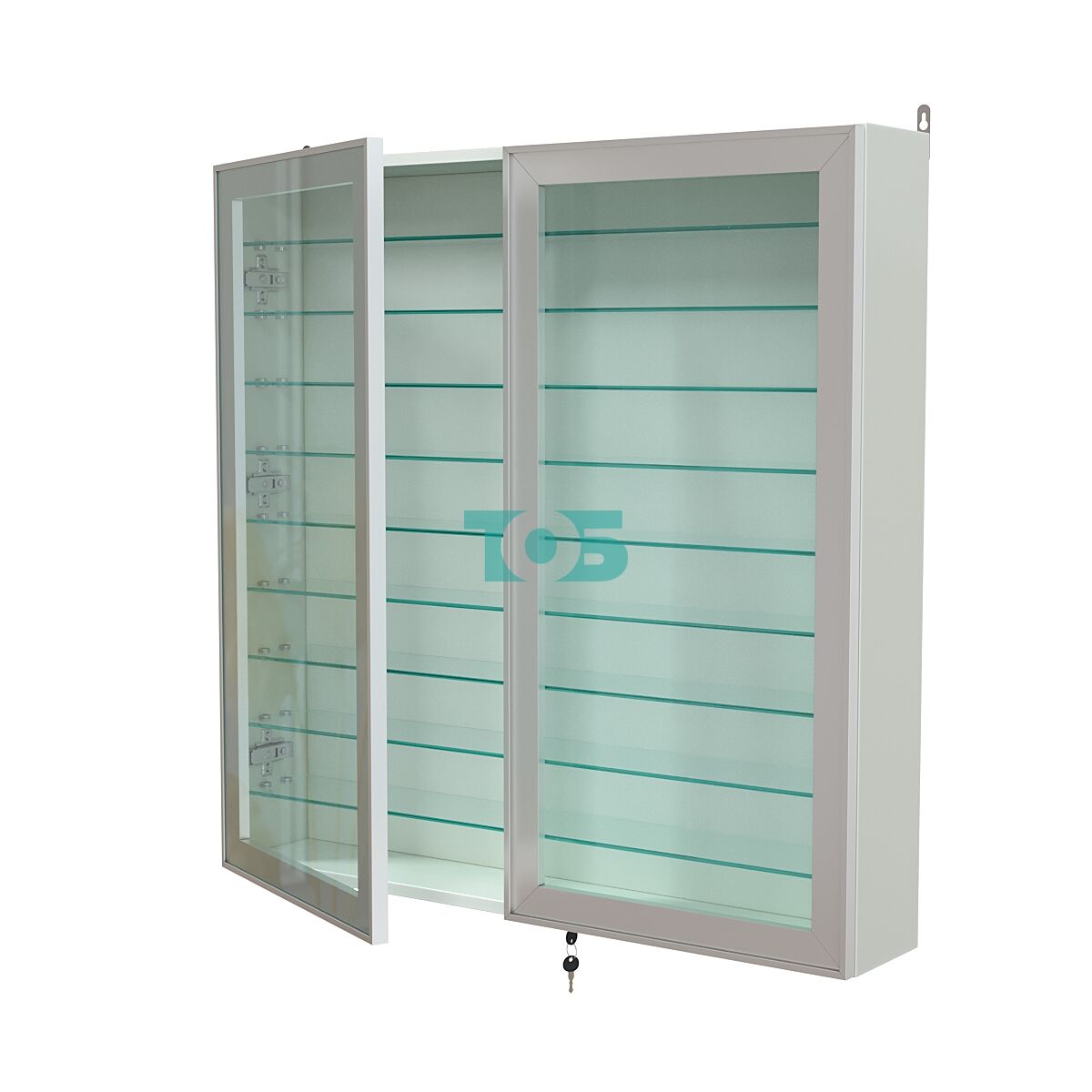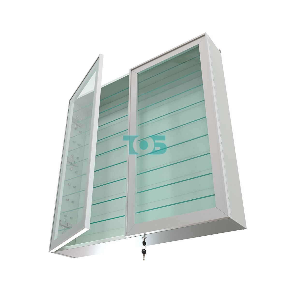 Две стеклянные распашные двери в алюминиевом каркасе с надёжным замком — обеспечивают удобный доступ к содержимому и максимальную защиту от несанкционированного доступа