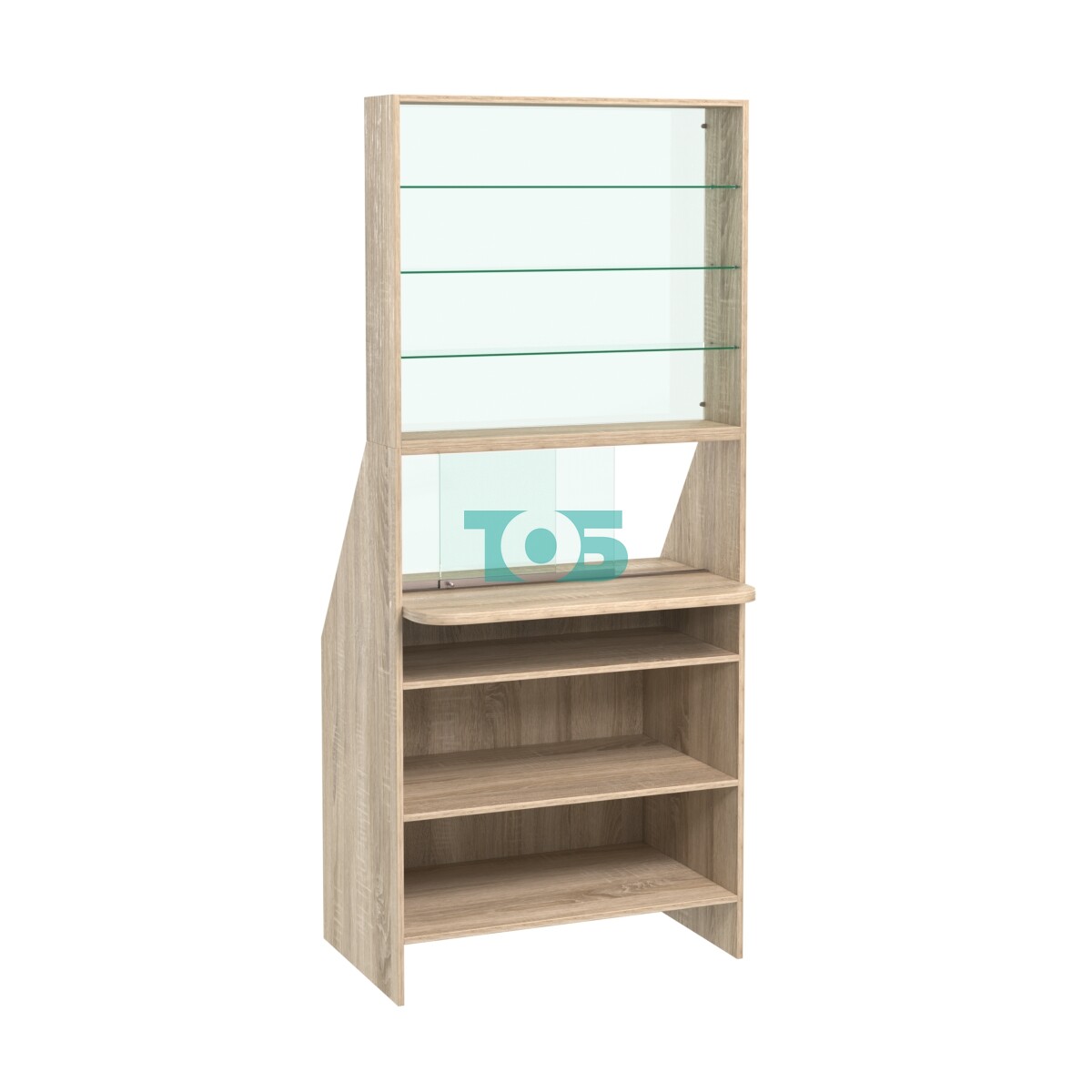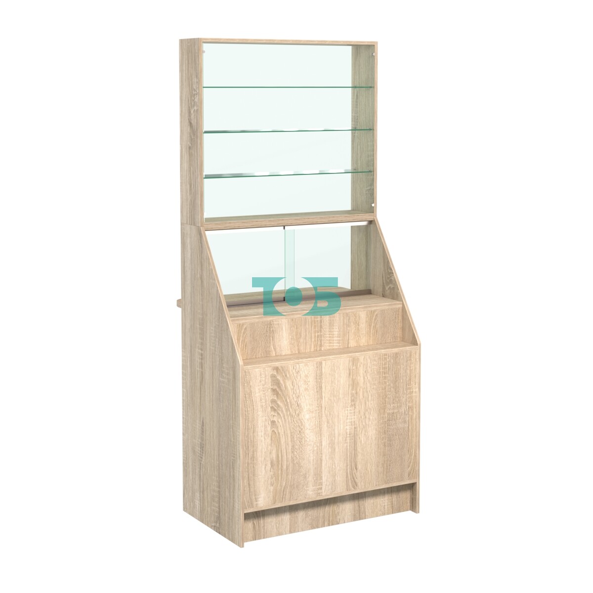 Полки: в верхней части витрины расположены три стеклянные полки, на которых можно разместить товары для демонстрации.