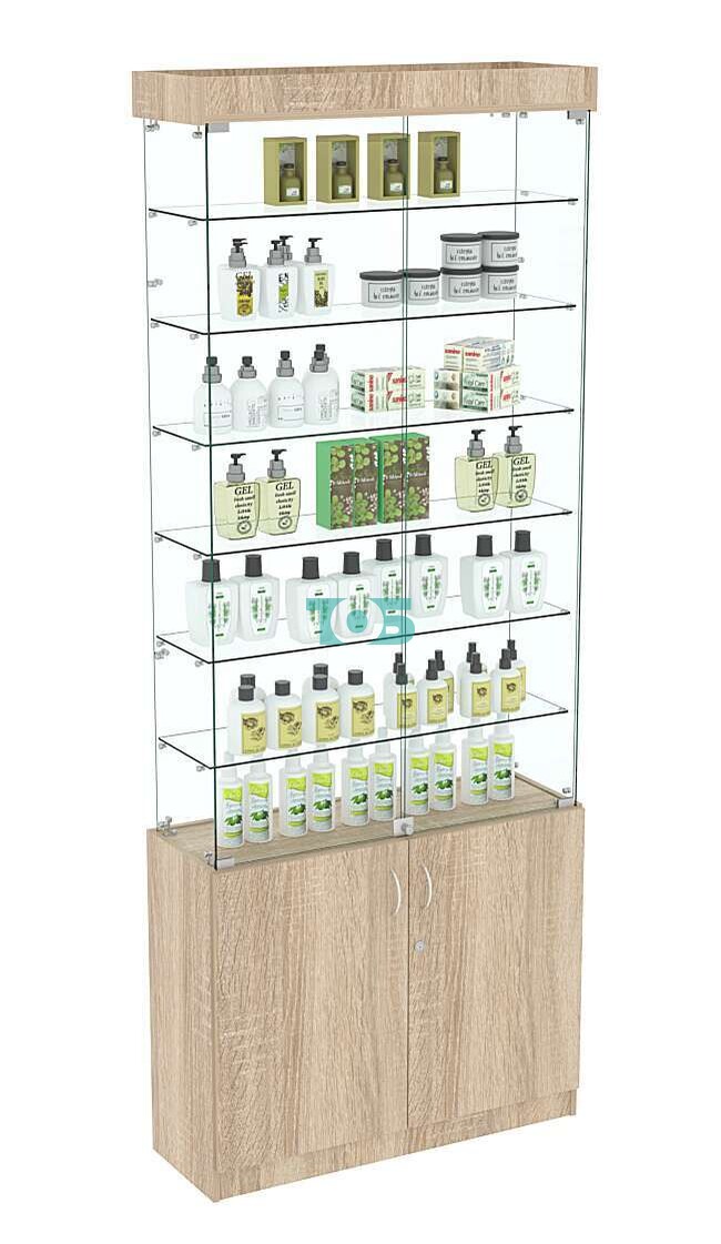 - Распашные стеклянные двери с замком: Расположены в верхней части витрины, обеспечивая удобный доступ к товарам и их безопасное хранение.