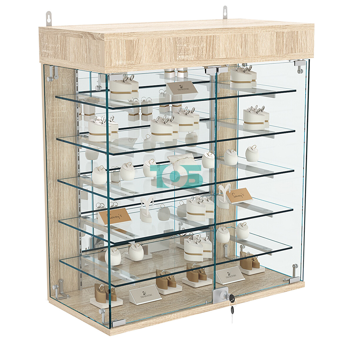 Стеклянная торговая витрина широкая с верхней подсветкой и маленькими прозрачными полками Фрактал №1-1