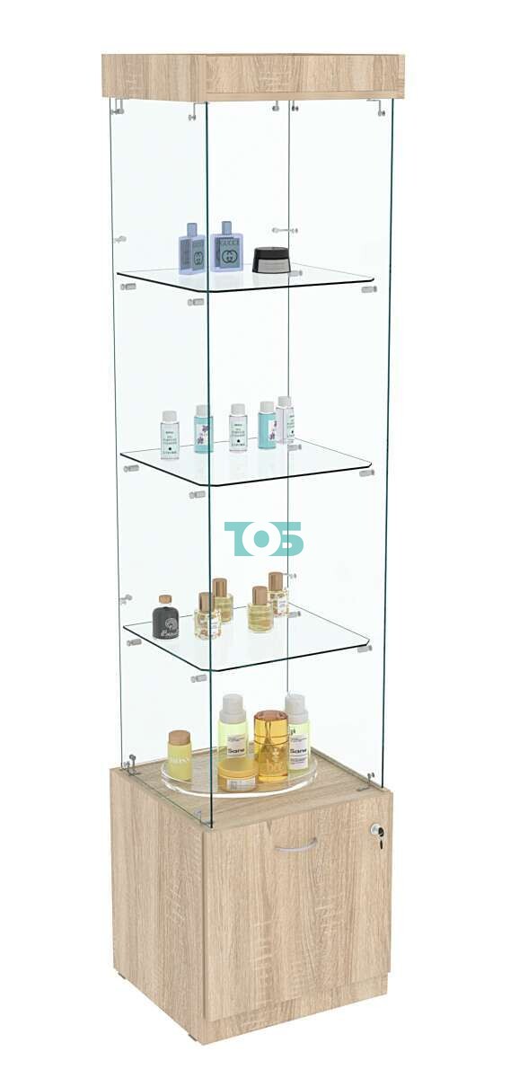 Накопитель с выдвижным ящиком: в нижней части витрины расположен глубокий выдвижной ящик с врезным замком. Его можно использовать для хранения сопутствующих товаров или документов, что добавляет дополнительное удобство в использовании витрины.