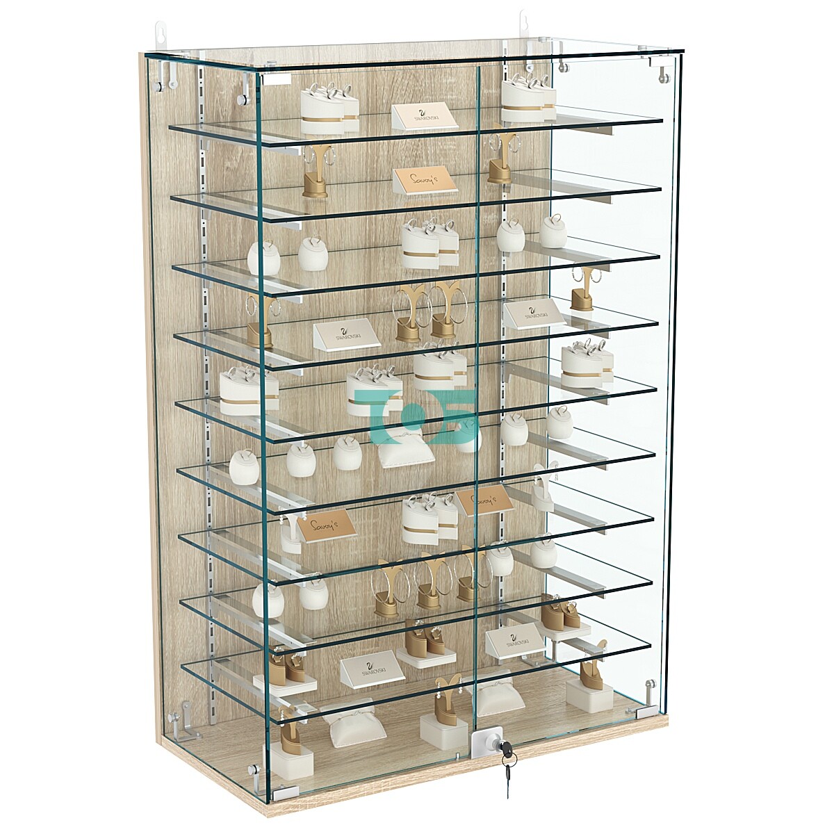Стеклянная торговая витрина широкая с верхней подсветкой и маленькими прозрачными полками Фрактал №1-1