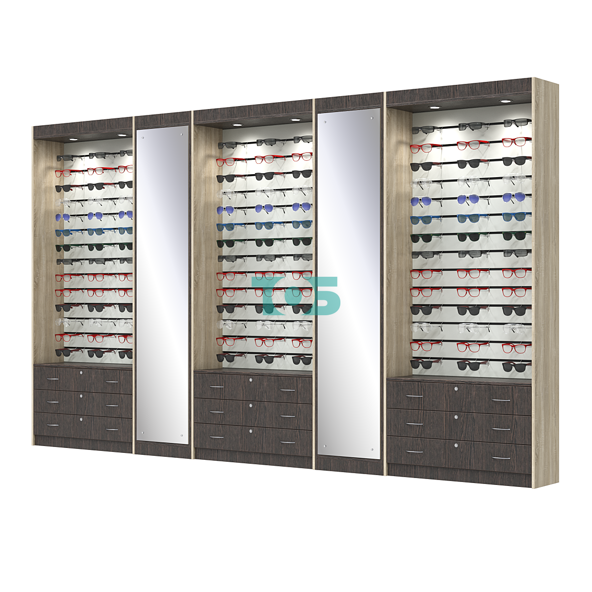 Отсутствие стеклянных дверей: витрины выполнены без стеклянных дверей, что обеспечивает открытый доступ к очкам и упрощает процесс выбора для покупателей.