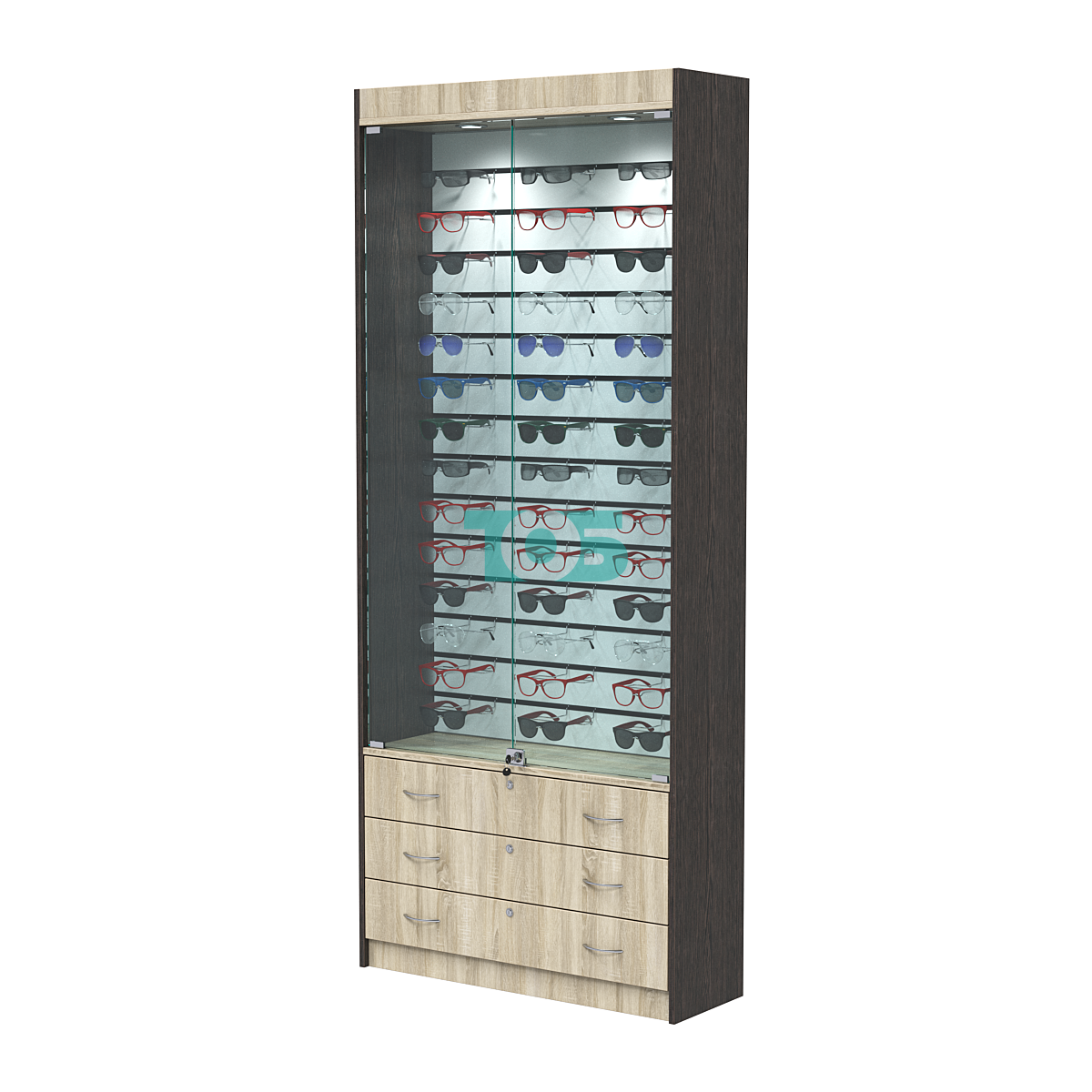 Выдвижные ящики: в накопителе витрины есть три выдвижных ящика, которые также запираются на замок. Ящики удобны для хранения мелких аксессуаров или дополнительных пар очков.
