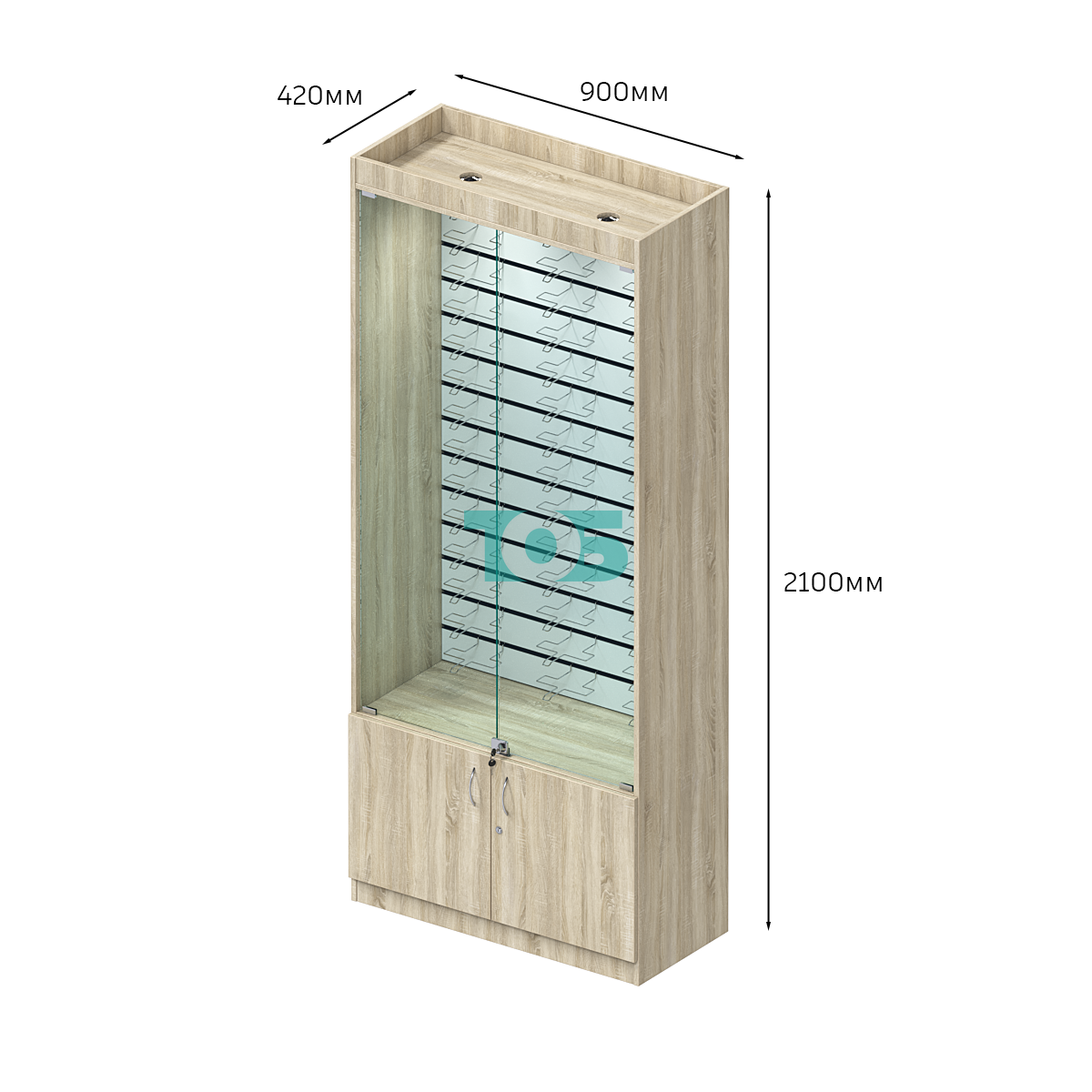 Нижняя часть: оснащена распашными дверями с замком, что позволяет безопасно хранить дополнительные товары или аксессуары.