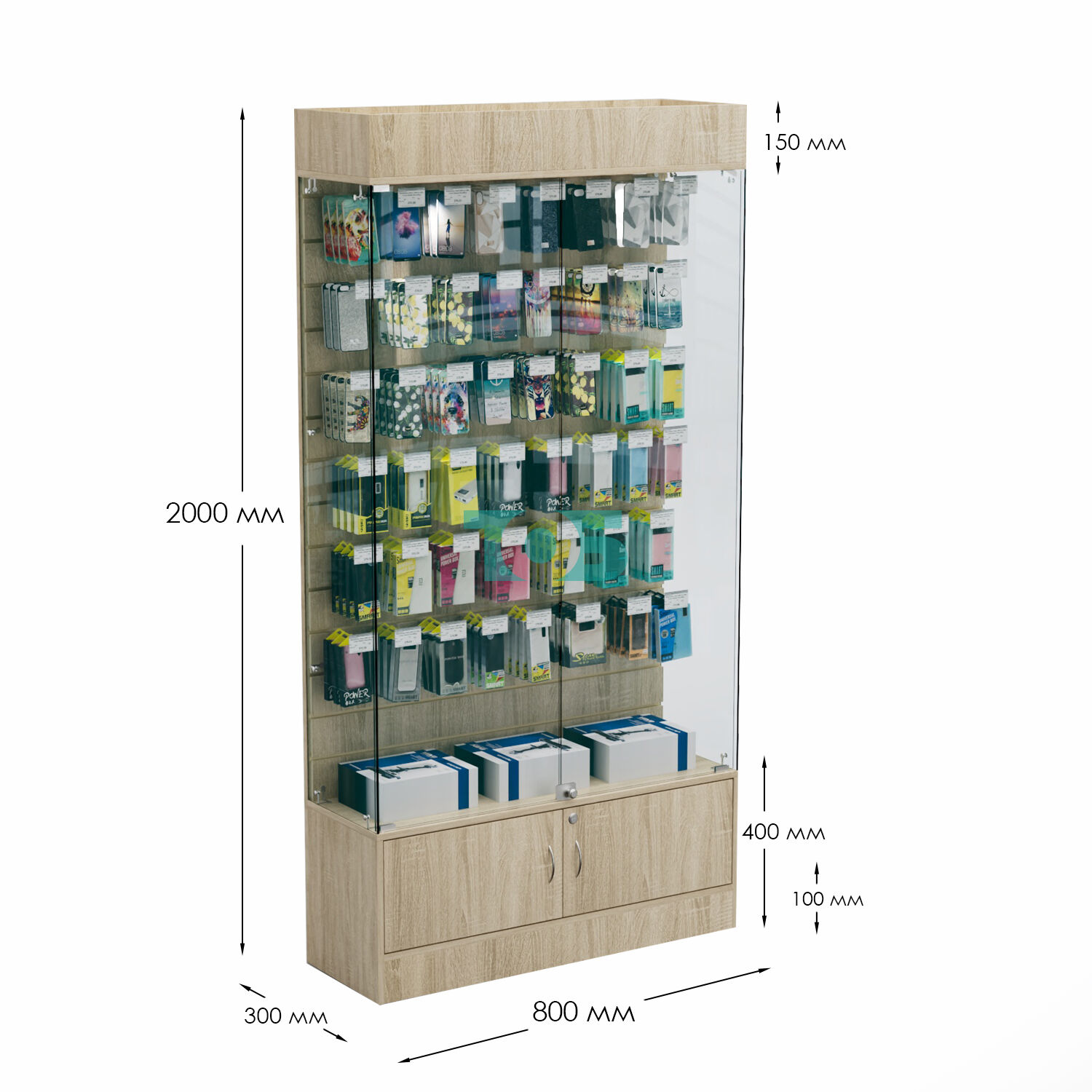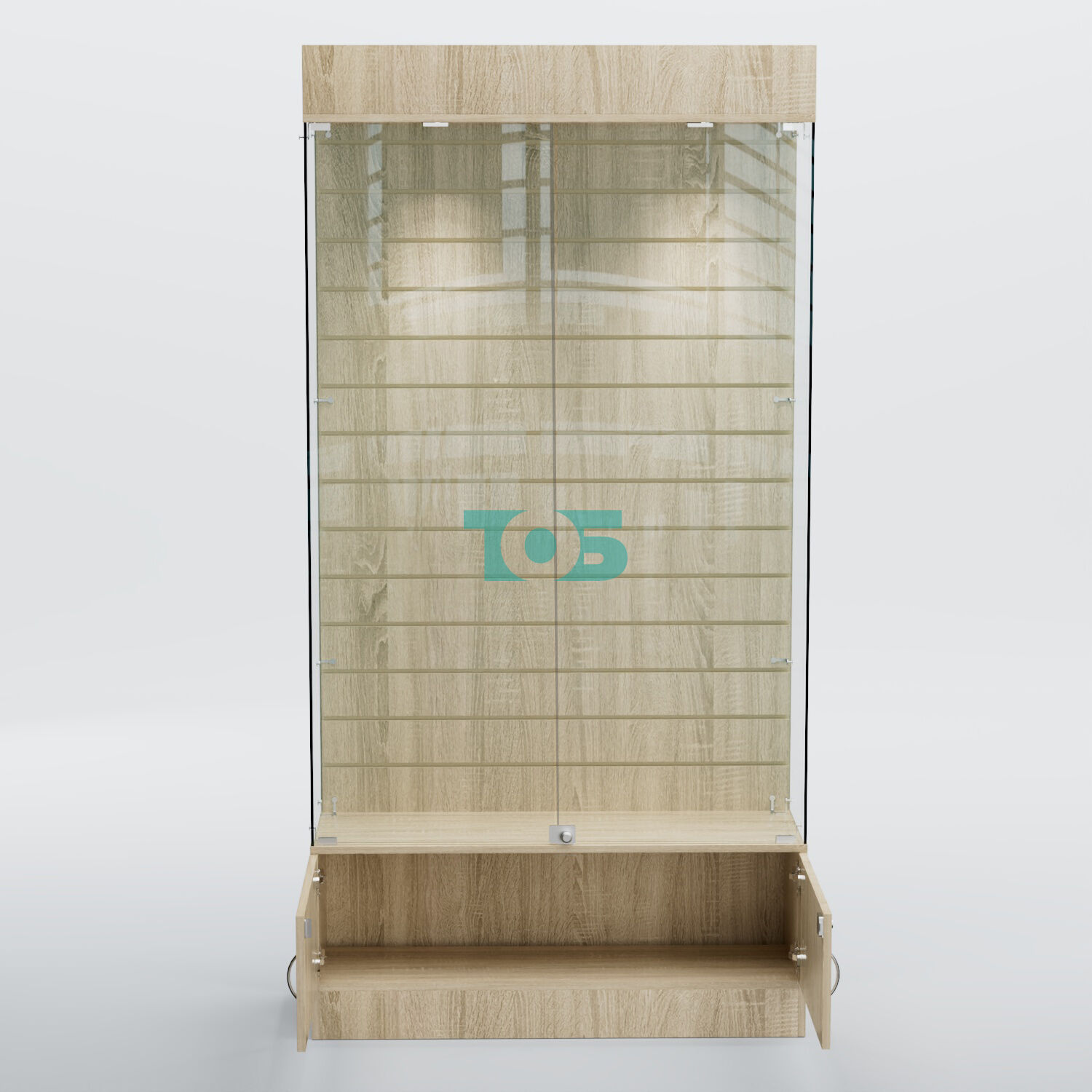 - прозрачная часть закрыта распашными стеклянными дверками с замком;