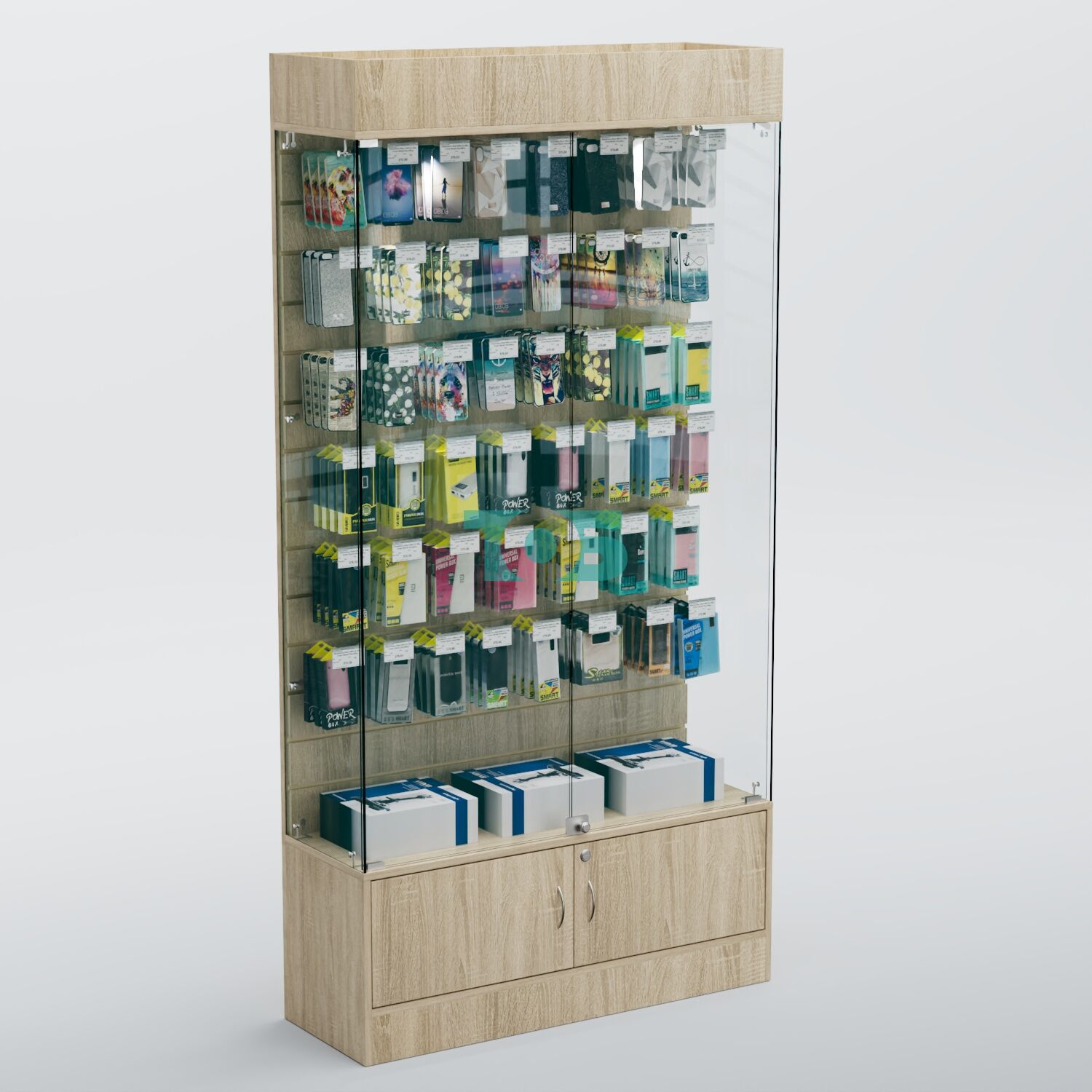 Витрина с эконом-панелью для салона связи №3 предлагает широкий обзор товара и функциональность.