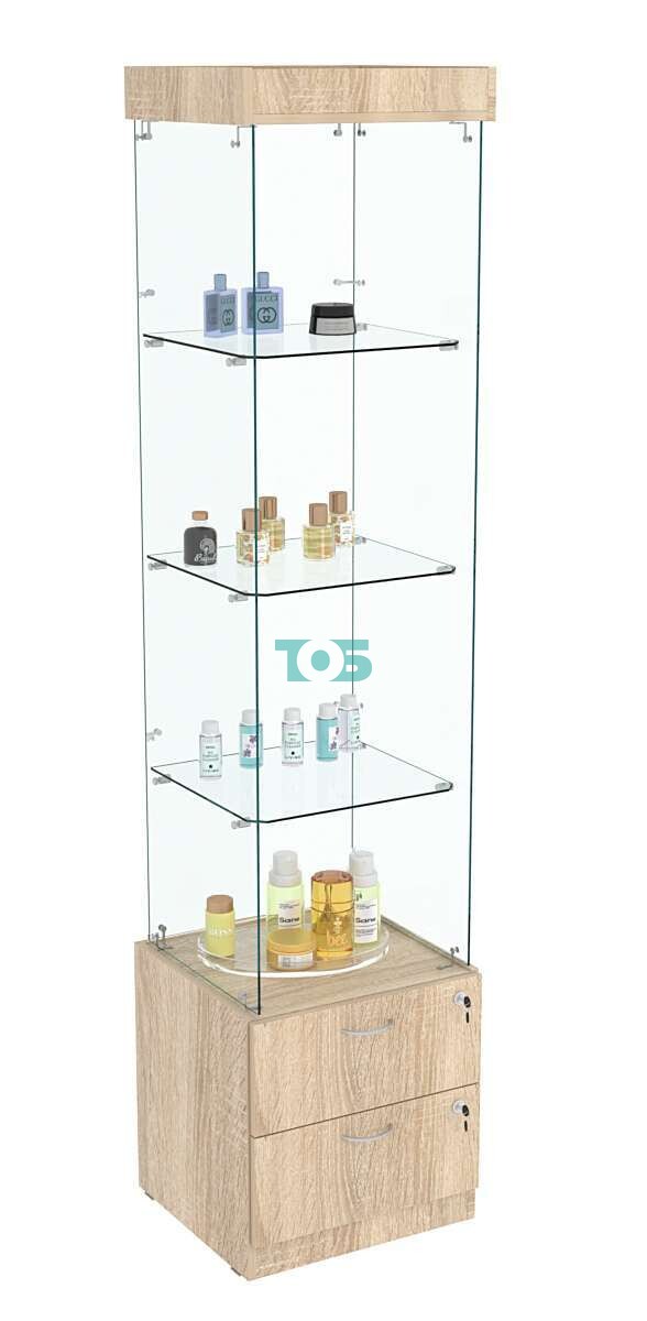 Накопитель с выдвижными ящиками: в конструкции витрины предусмотрены два выдвижных ящика с врезными замками. Это позволяет хранить дополнительные товары или аксессуары, обеспечивая их безопасность и порядок.