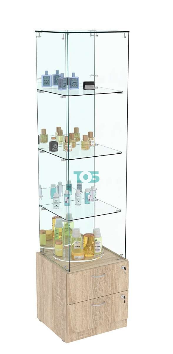 Накопитель с выдвижными ящиками: в конструкции витрины предусмотрены два выдвижных ящика с врезными замками. Это позволяет хранить дополнительные товары или аксессуары, обеспечивая их безопасность.