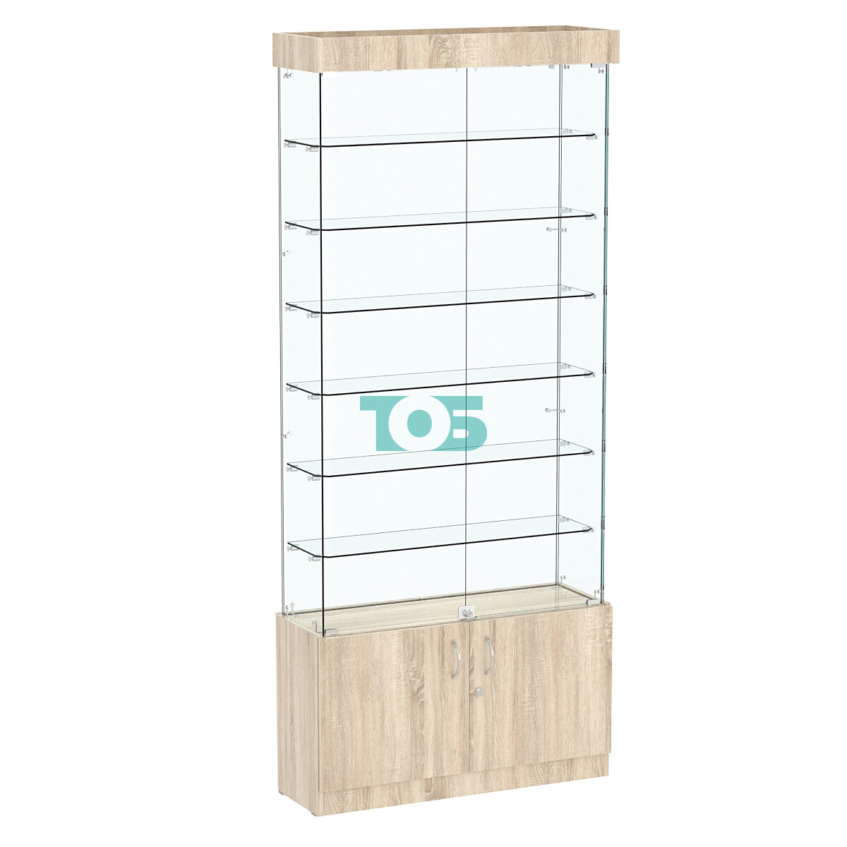 - Двери с замком: Витрина оборудована распашными стеклянными дверями с замком в прозрачной части для защиты выставленных товаров и распашными дверями с замком в нижней части для хранения дополнительных запасов.