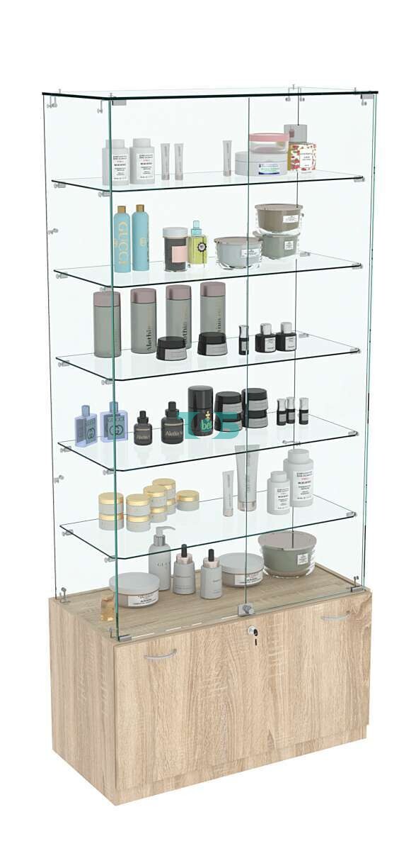 • Задняя стенка: стеклянная задняя стенка придаёт витрине стильный вид и помогает покупателям рассмотреть товар со всех сторон.