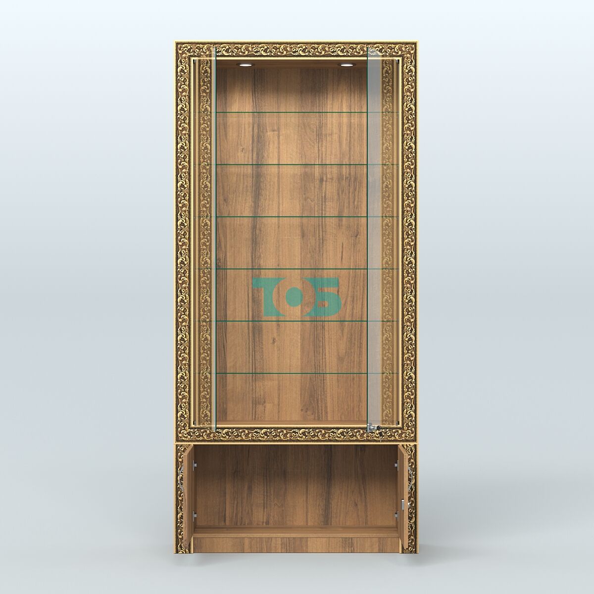 - серия витрин у которых фасадная часть декорированная цветными молдингами под золото. Эти элементы подчеркивают четкость линий, что помогает вписать витрину в интерьер любого стиля;