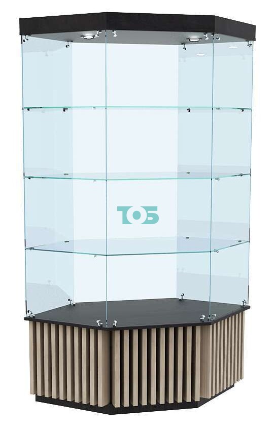 Отличия модели витрины внешнего угла с планками и тремя полками серии ВЕРТИКАЛЬ №103: