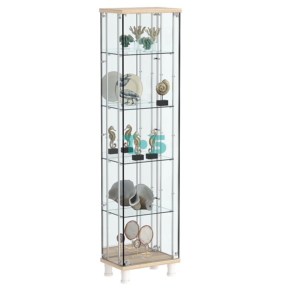 • Стеклянные полки: Внутри витрины находится четыре стеклянные полки, обеспечивающие надежность и стильный вид. Среднее расстояние между полками составляет 334 мм, что позволяет удобно располагать товары различной высоты.