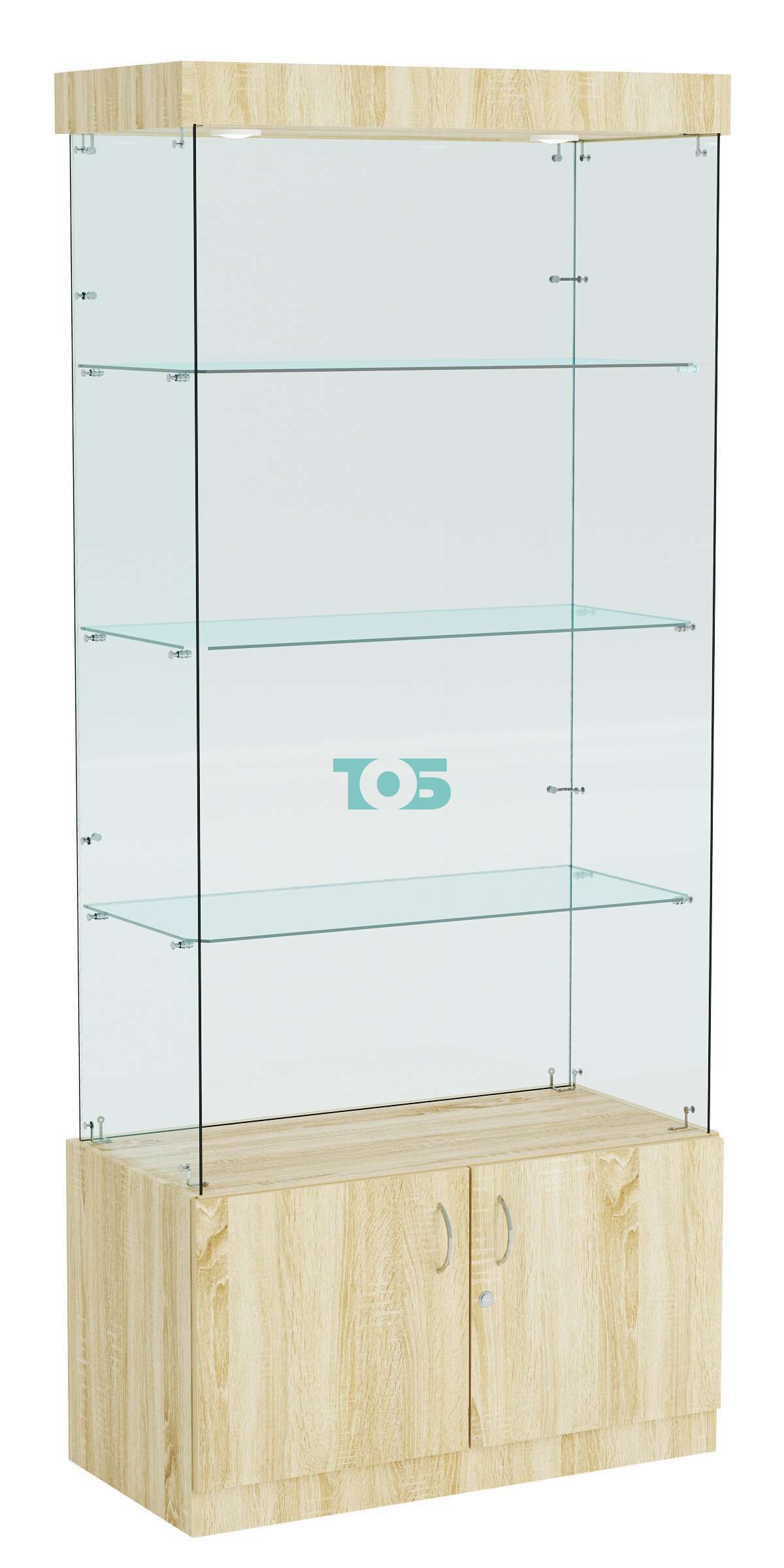 Стеклянная торговая витрина широкая с верхней подсветкой и маленькими прозрачными полками Фрактал №1-1