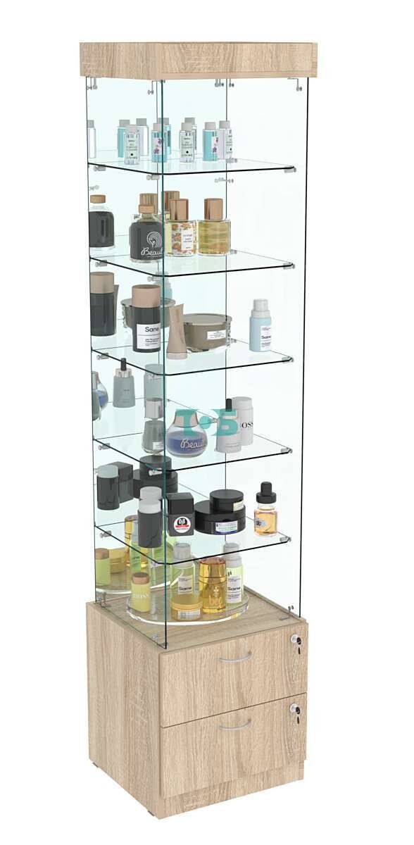 Накопитель с выдвижными ящиками: в конструкции витрины предусмотрены два выдвижных ящика с врезными замками. Это позволяет хранить дополнительные товары или аксессуары, обеспечивая их безопасность.