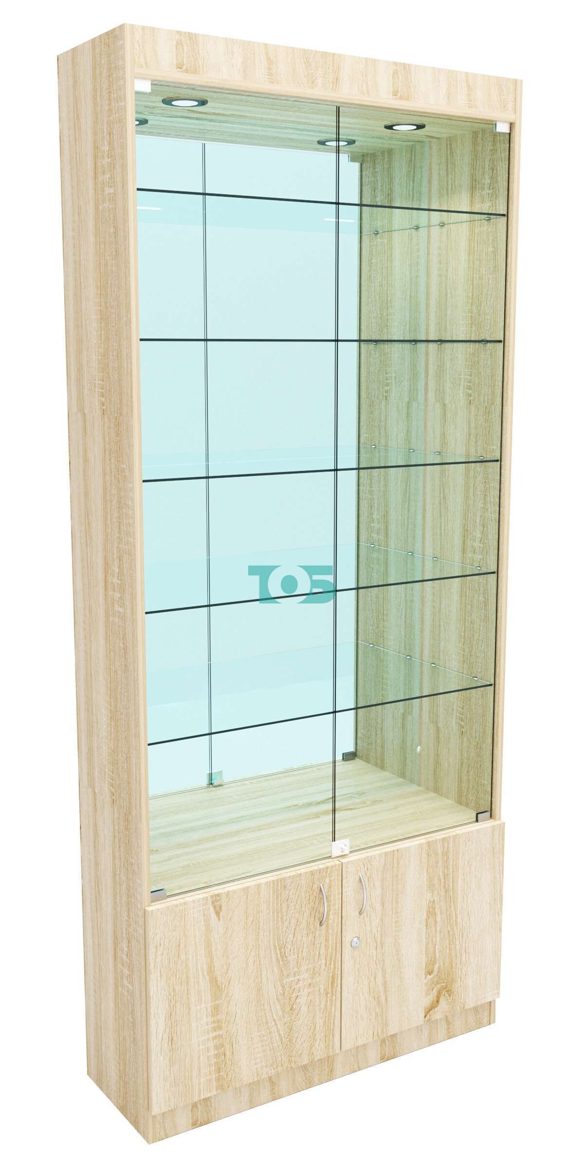 Стеклянная торговая витрина широкая с верхней подсветкой и маленькими прозрачными полками Фрактал №1-1