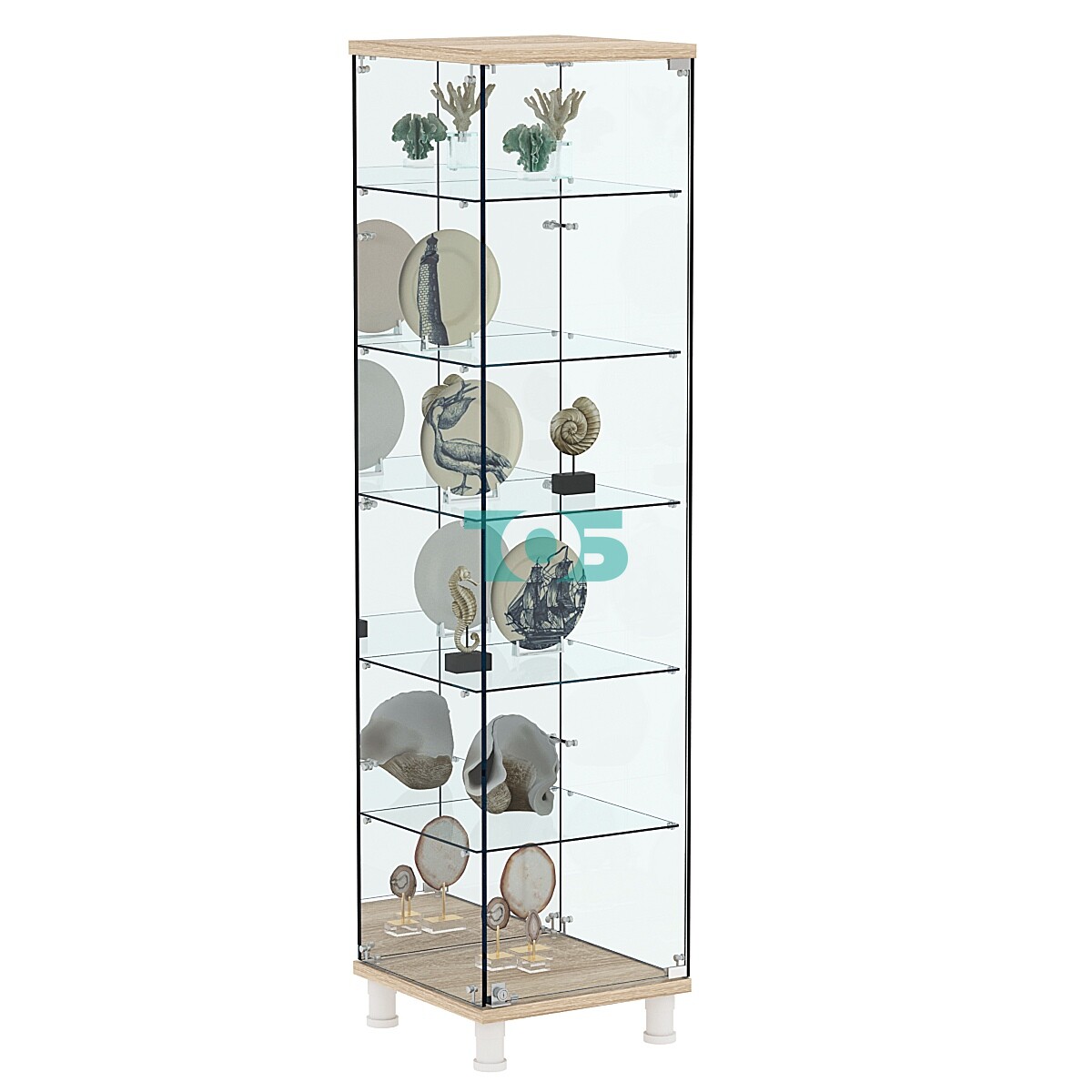 • Полки: Витрина оснащена пятью стеклянными полками, расстояние между которыми составляет 275 мм, что обеспечивает удобное размещение различных товаров.