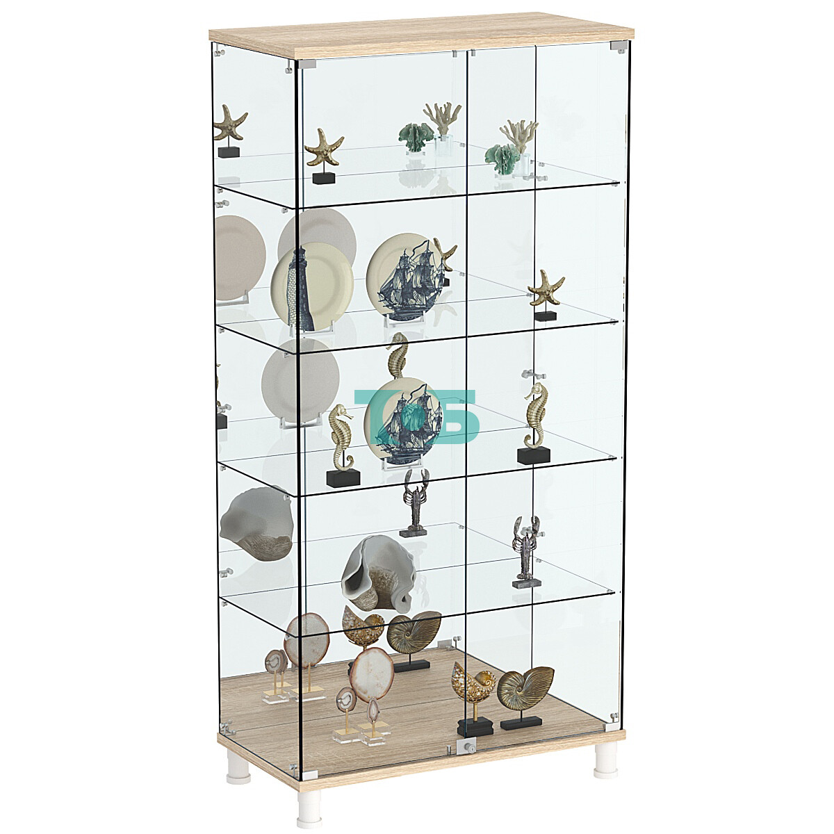 Витрина оснащена четырьмя стеклянными полками с расстоянием между ними в 334 мм, предоставляя достаточное пространство для размещения изделий разной высоты и формата.