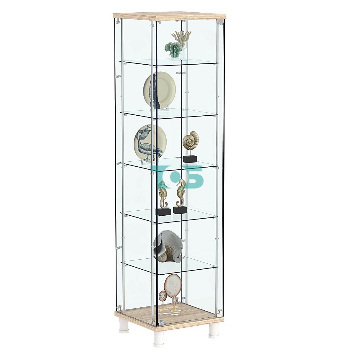 • Хромированные стойки: Витрина оборудована четырьмя хромированными металлическими стойками с перфорацией, что дает возможность устанавливать стеклянные полки на необходимой высоте в зависимости от ваших нужд.