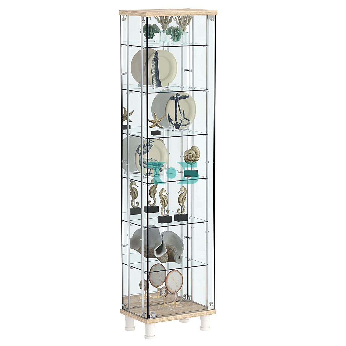 • Регулируемая высота: Ножки высотой 100 мм обеспечивают регулировку высоты, что позволяет адаптировать витрину под ваши нужды и интерьер.