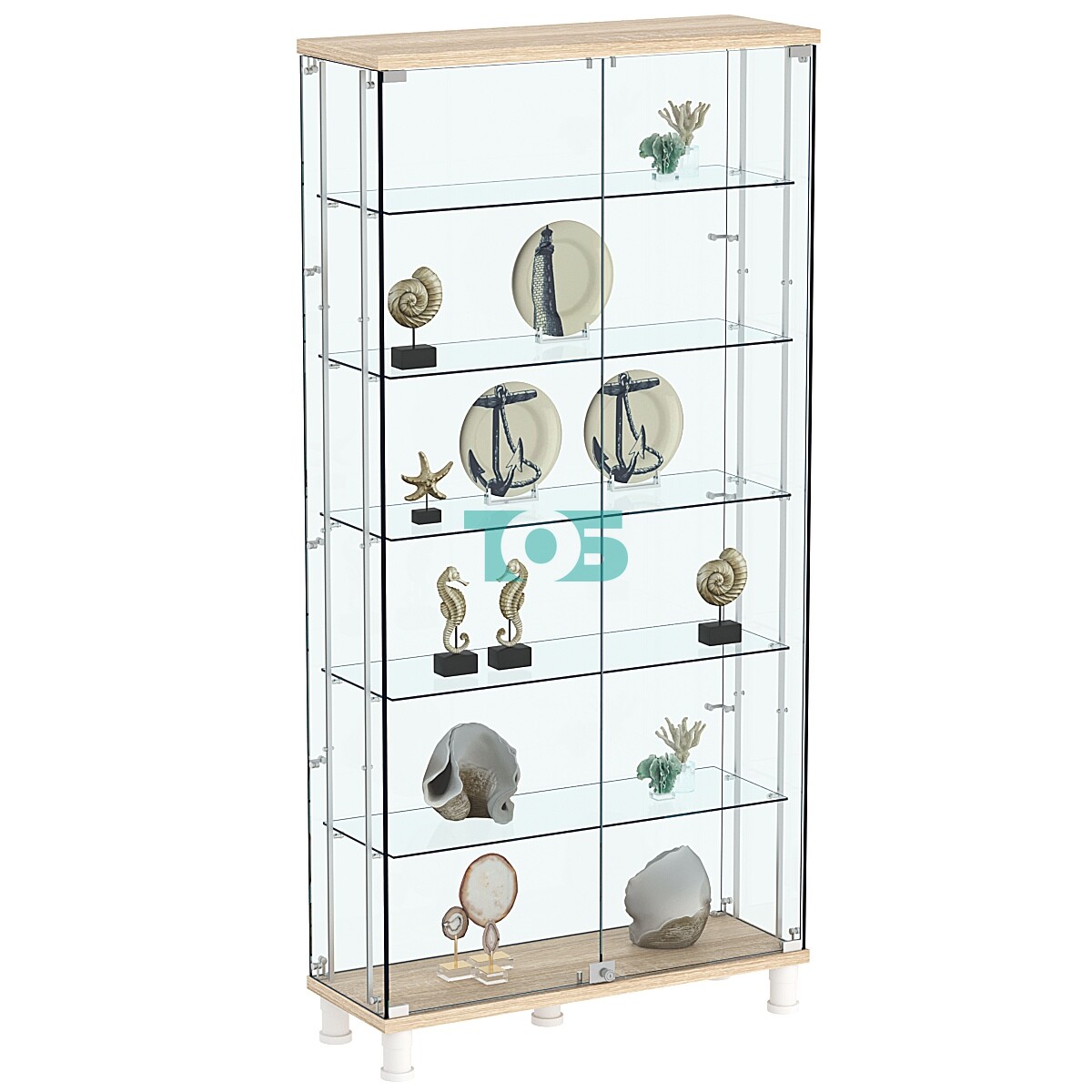 • Количество полок: Витрина укомплектована пятью стеклянными полками, что предоставляет достаточно пространства для демонстрации разных товарных позиций, а среднее расстояние между полками в 275 мм позволяет размещать предметы различной высоты.
