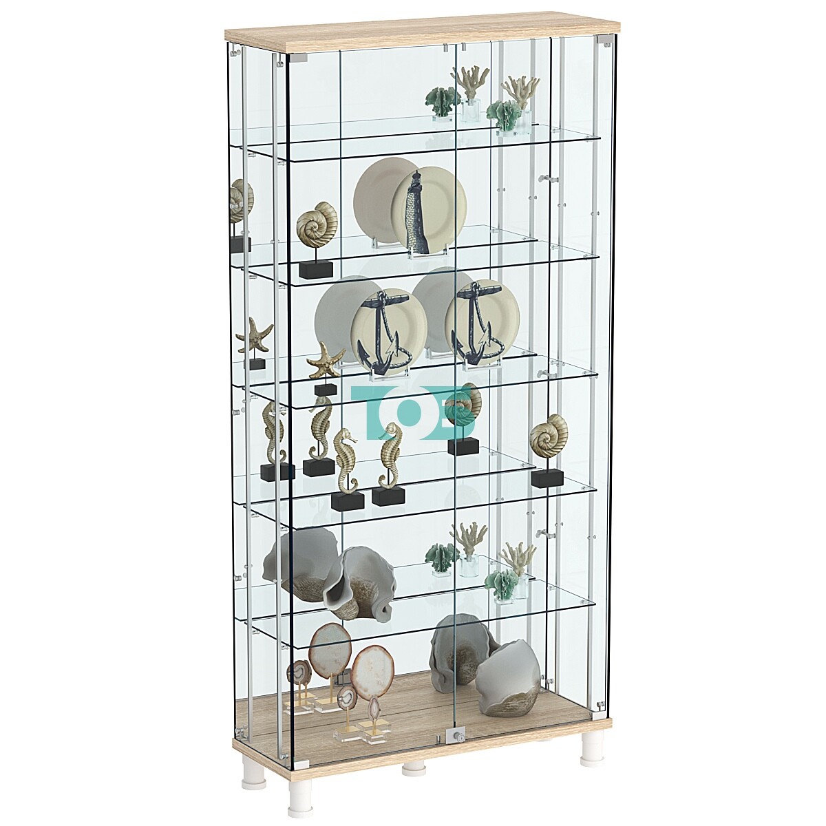Витрина оснащена четырьмя хромированными металлическими стойками с перфорацией, которые позволяют устанавливать стеклянные полки на желаемой высоте. Это гарантирует максимальную гибкость при размещении разнообразных товаров.
