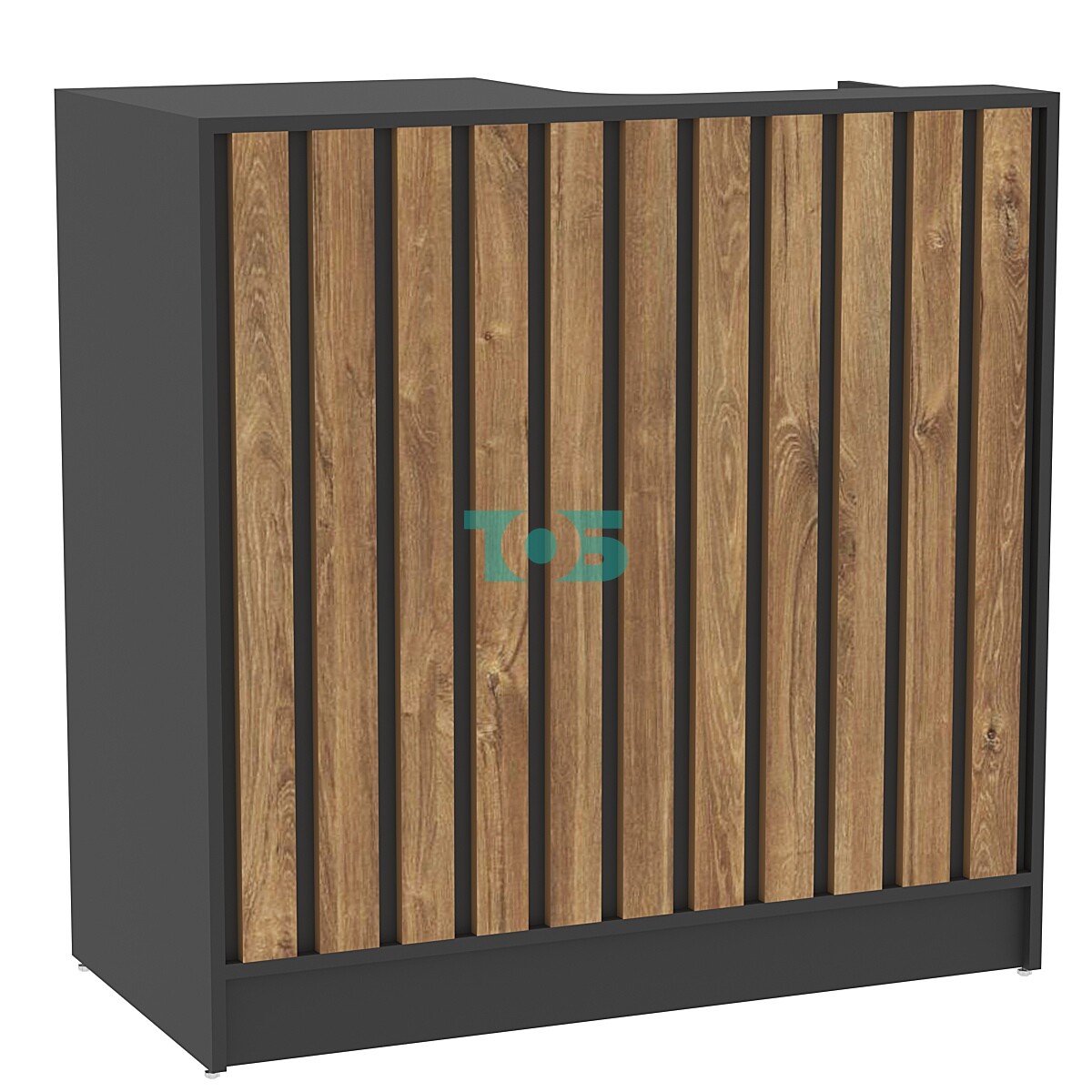 Фасад: декорирован рейками из ДСП 16 мм шириной 60 мм с шагом 20 мм, придавая прилавку элегантный и современный вид.