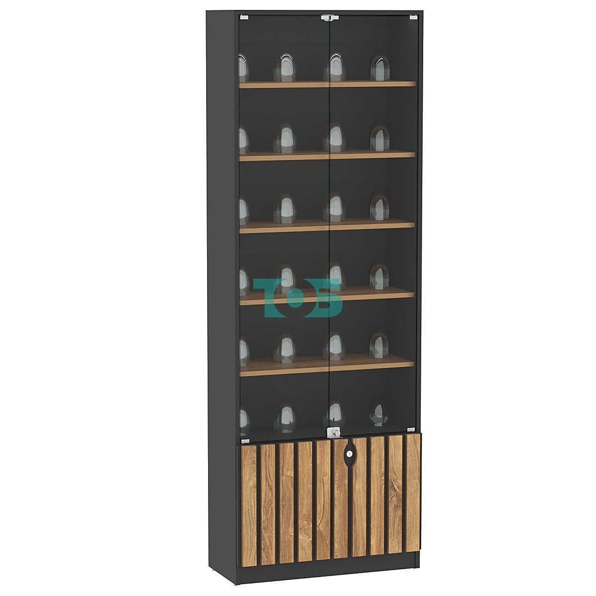 Декорирование: двери накопителя декорированы рейками из ДСП 16 мм шириной 50 мм с шагом 20 мм, что придает витрине элегантный вид.