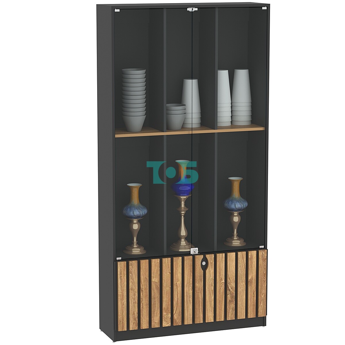 Декорированные двери: двери накопителя украшены рейками из ДСП 16 мм шириной 50 мм с шагом 20 мм, придавая витрине стильный и современный вид.