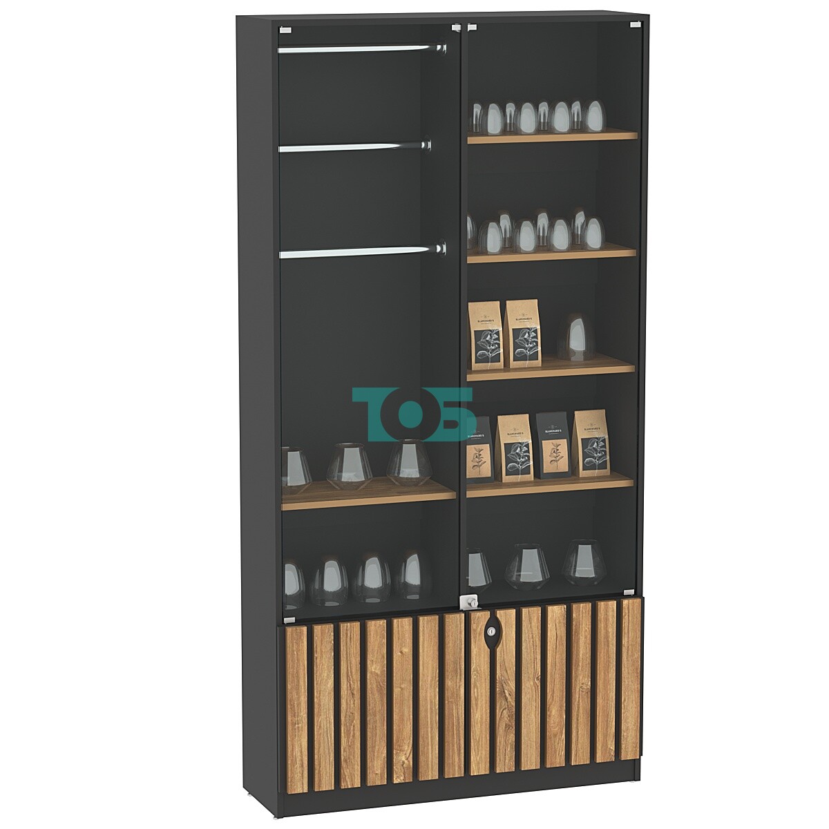 Функциональность: витрина оснащена как открытыми, так и закрытыми полками, что позволяет эффективно использовать пространство для хранения и демонстрации различных товаров.